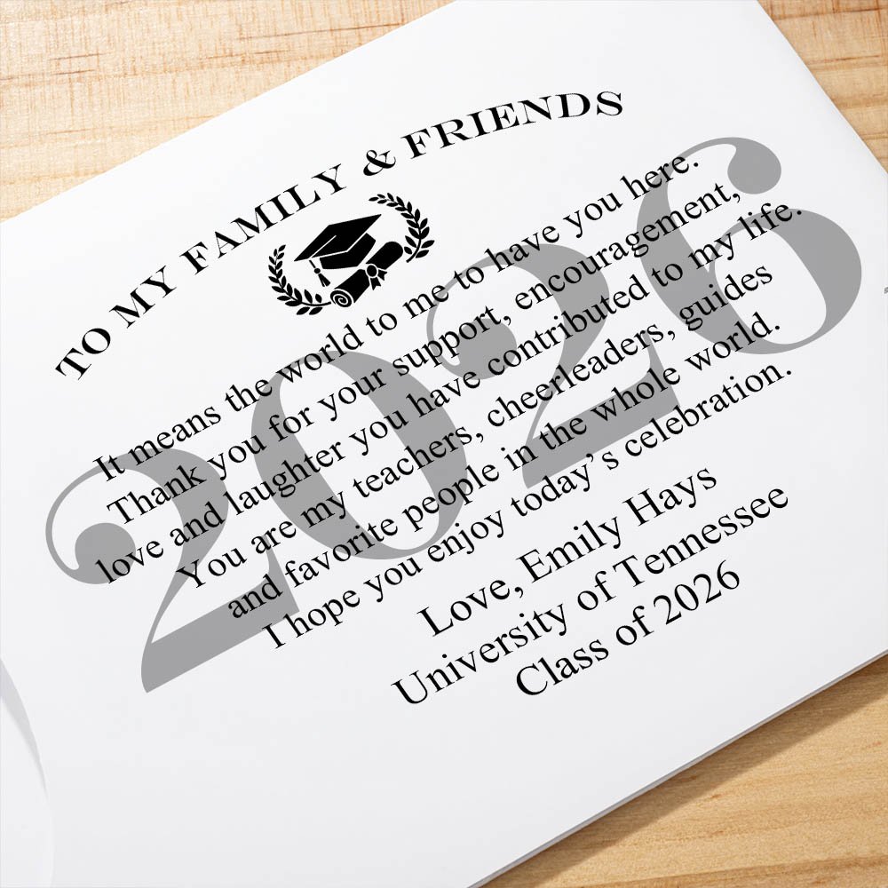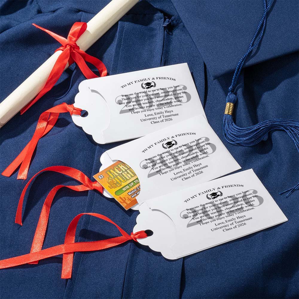 Deze enveloppen voor loten zijn zorgvuldig ontworpen met een bedankbericht op de omslag. Elke envelop kan worden versierd met een lintkleur, wat een vleugje ceremonie en elegantie toevoegt aan de presentatie. Je kunt elke envelop aanpassen met de naam van de afgestudeerde, het afstudeerjaar en de naam van de school, zodat ze een gedenkwaardig aandenken aan het afstudeerfeest worden.