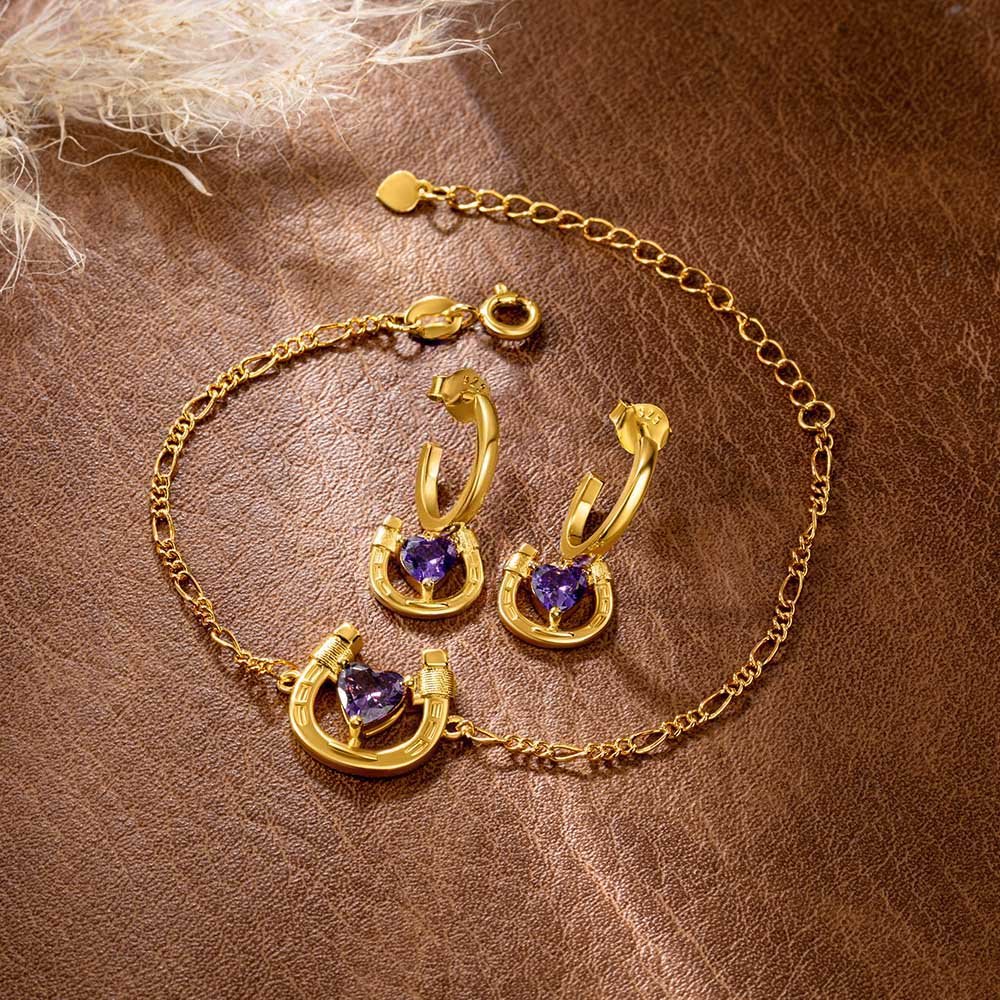 De hanger van dit sieraad heeft een stijlvol ontwerp van een hoefijzer versierd met een aangepaste en fonkelende geboortesteen. Het hoefijzer symboliseert geluk en bescherming, terwijl de hartvormige geboortesteen liefde en zorgzaamheid uitstraalt, waardoor dit sieraad een opvallend accessoire is. We bieden twee stijlen armbanden en oorbellen, en je kunt kiezen op basis van je voorkeur.