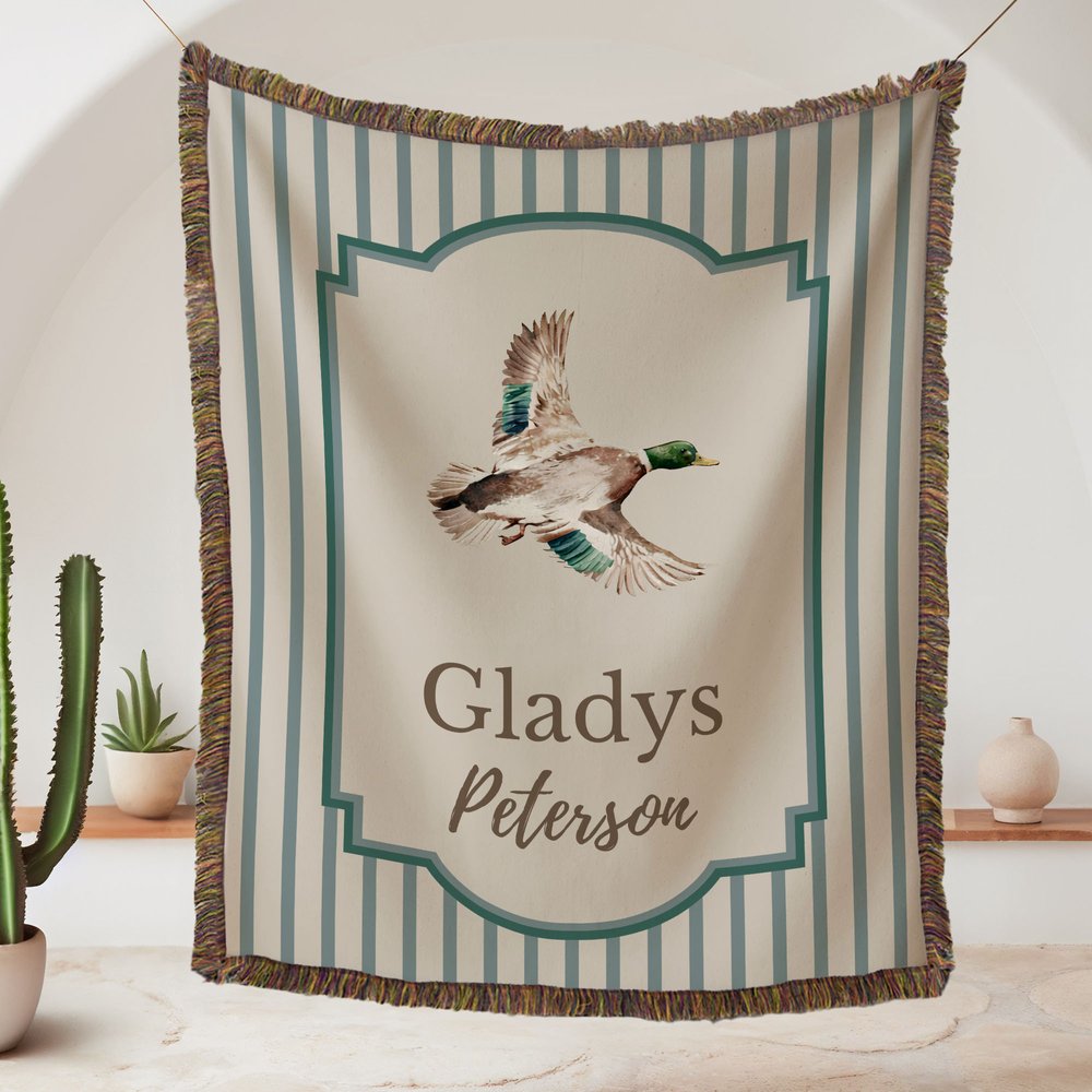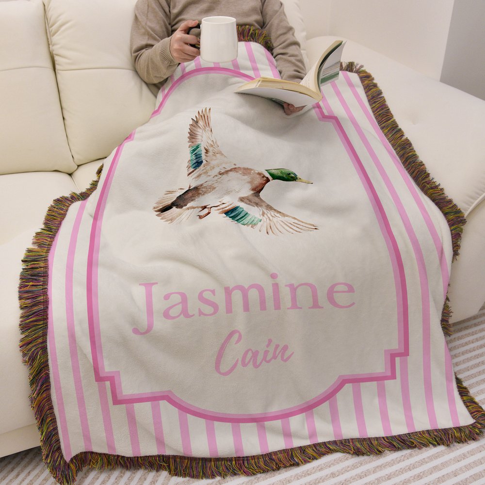 Gepersonaliseerde Mallard Duck Patroon Gestreepte Tassel Woven Deken met Naam Dagelijks Gebruik Verjaardagscadeau voor Pasgeboren Nieuwe Ouders