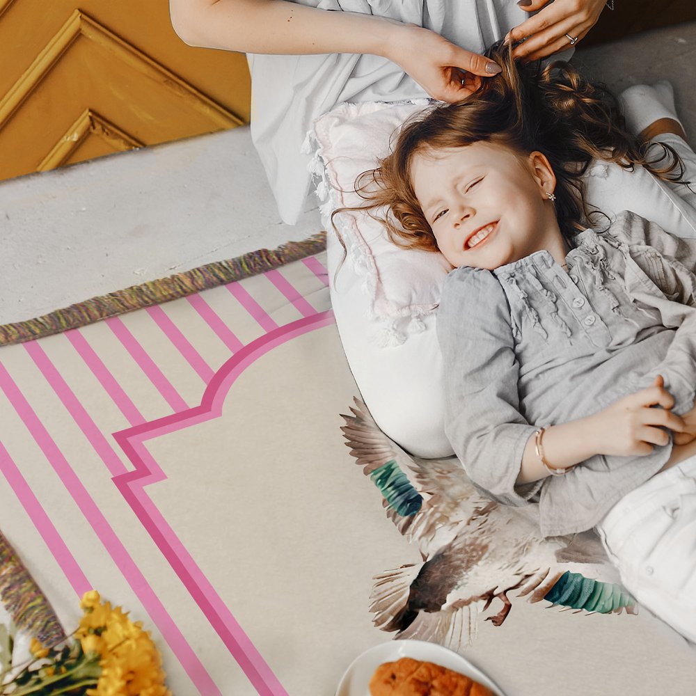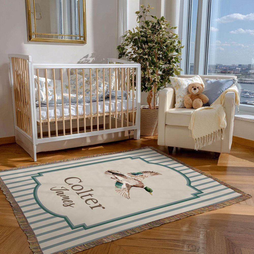 Het aquarelachtige wilde eendenpatroon is levendig en levendig, gecombineerd met een fris gestreepte rand die vintage charme combineert met een vleugje kinderlijke lieflijkheid. Gepersonaliseerd met een eigen naam in een elegant lettertype, wordt elke deken een uniek aandenken om de groei van een kind te vieren.
