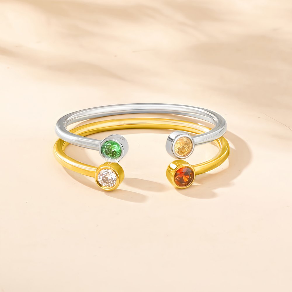 Elke ring kan worden aangepast met twee geboortestenen, die staan voor speciale relaties, belangrijke data of betekenisvolle connecties. De doordachte combinatie van stenen creëert een uniek stuk dat een persoonlijk verhaal vertelt door middel van elegante eenvoud.