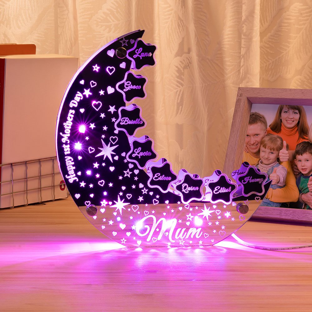 Hij heeft de vorm van een grillige halve maan en is versierd met ontelbare sterren en hartjes, waardoor een dromerig hemels tafereel ontstaat. Het spiegelachtige oppervlak voegt een vleugje elegantie toe en reflecteert de lichten, waardoor het een visueel spektakel wordt. Wat het echt uniek maakt, is de mogelijkheid om het te personaliseren met 1 - 8 namen! Elke naam wordt kunstig op een ster geplaatst, waardoor dit lampje een decorstuk en een uniek aandenken wordt.