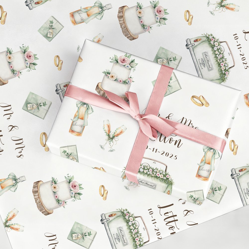 Dit cadeaupapier heeft de klassieke tekst "Mr & Mrs", gecombineerd met twee verschillende ontwerpopties: een champagnecollectie met ringen als thema en een lichtgroene collectie met groene retro trouwauto's als thema. Bovendien kun je dit inpakpapier personaliseren. Je kunt je familienaam en een speciale datum, zoals je trouwdag, verlovingsdatum of een andere gedenkwaardige gelegenheid, toevoegen aan het inpakpapier.