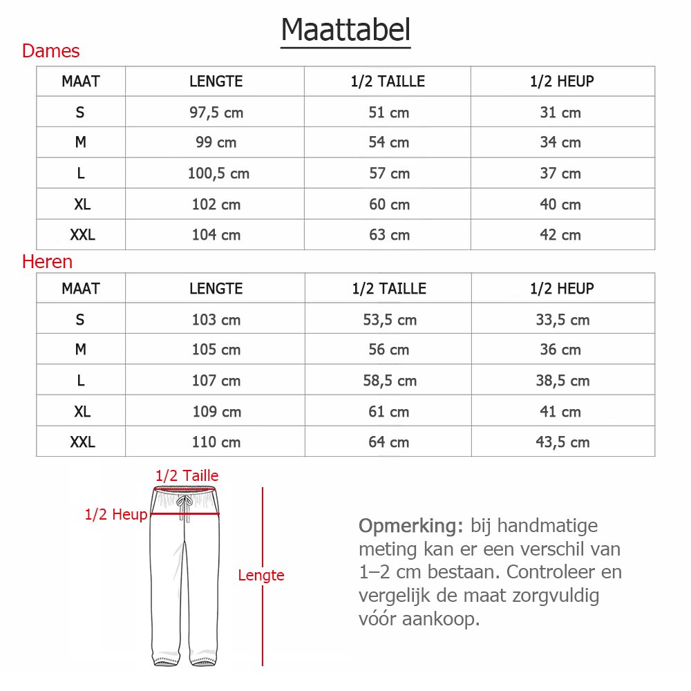 | Afmetingen: | Kinderhemd: 110 cm 120 cm 130 cm 140 cm 150 cm, Kinderbroek: 100 cm, 110 cm 120 cm 130 cm 140 cm 150 cm, 160 cm Damesshirt: S M L XL XXL, Damesbroek: S M L XL XXL Herenshirt: S M L XL XXL, Herenbroek: S M L XL XXL |