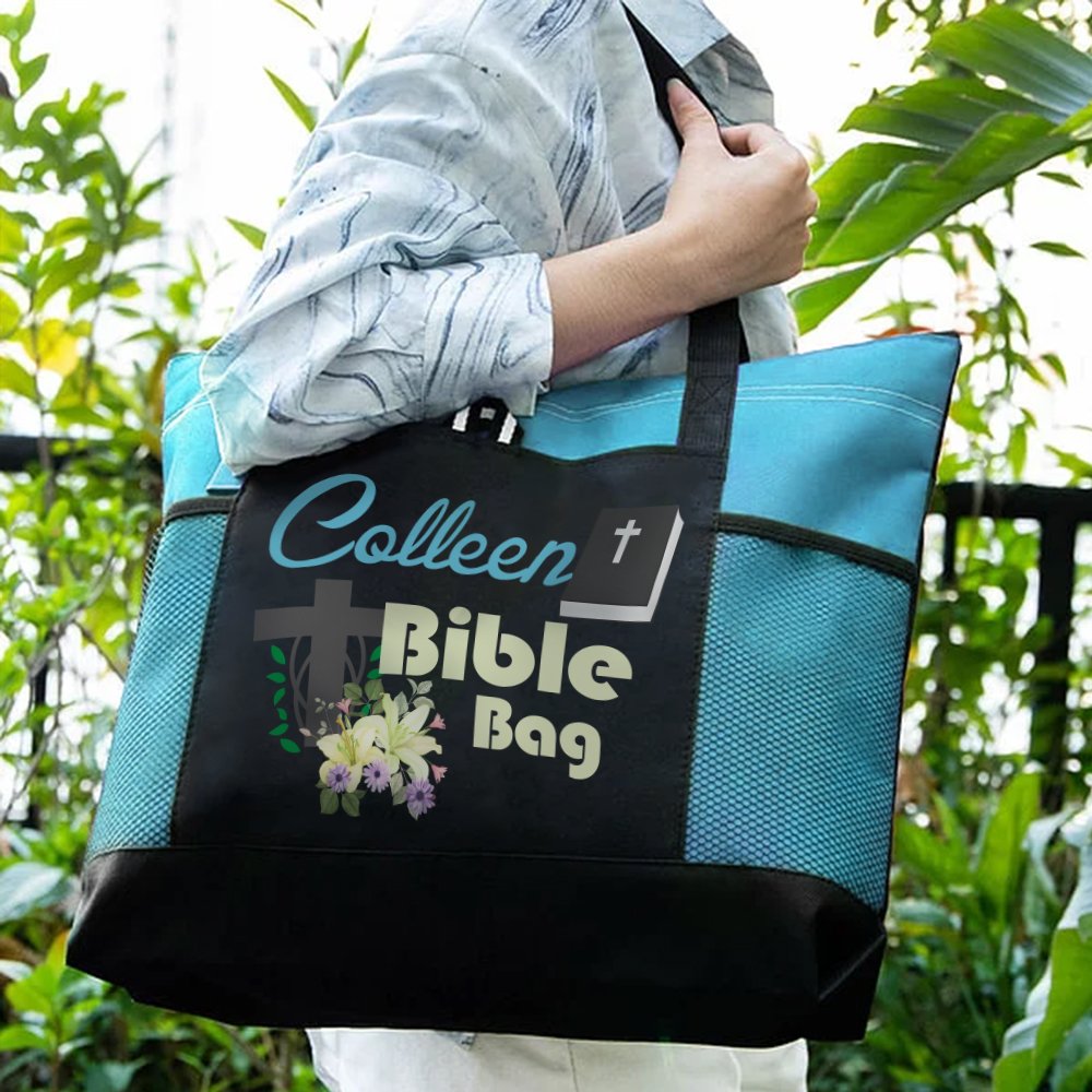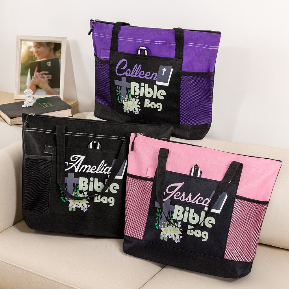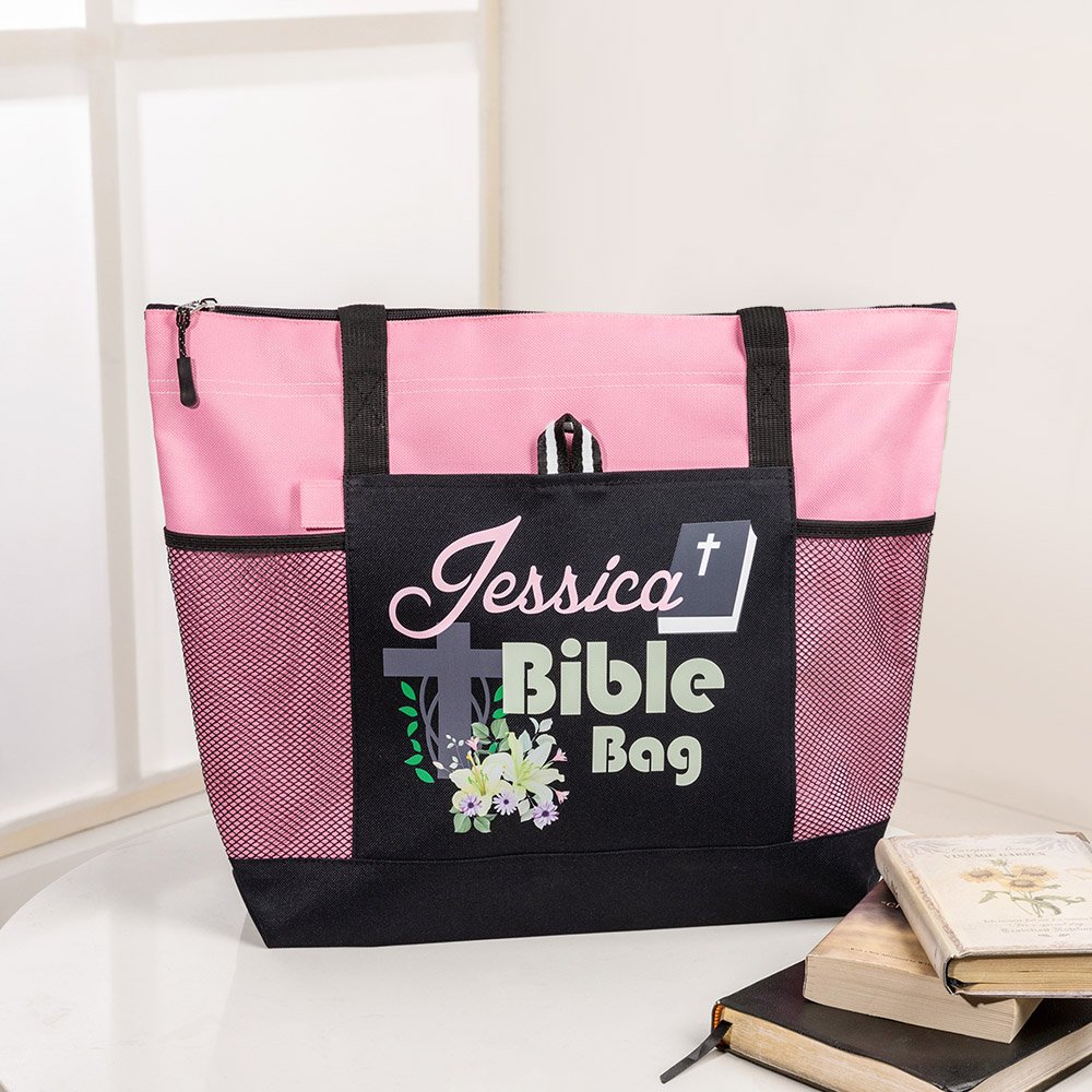 De iconische bijbel en het kruis zijn het kenmerkende ontwerp van onze draagtas. De combinatie van christelijke elementen en bloemen benadrukt het respect voor religieuze overtuigingen en is een symbool van de toewijding van christenen.