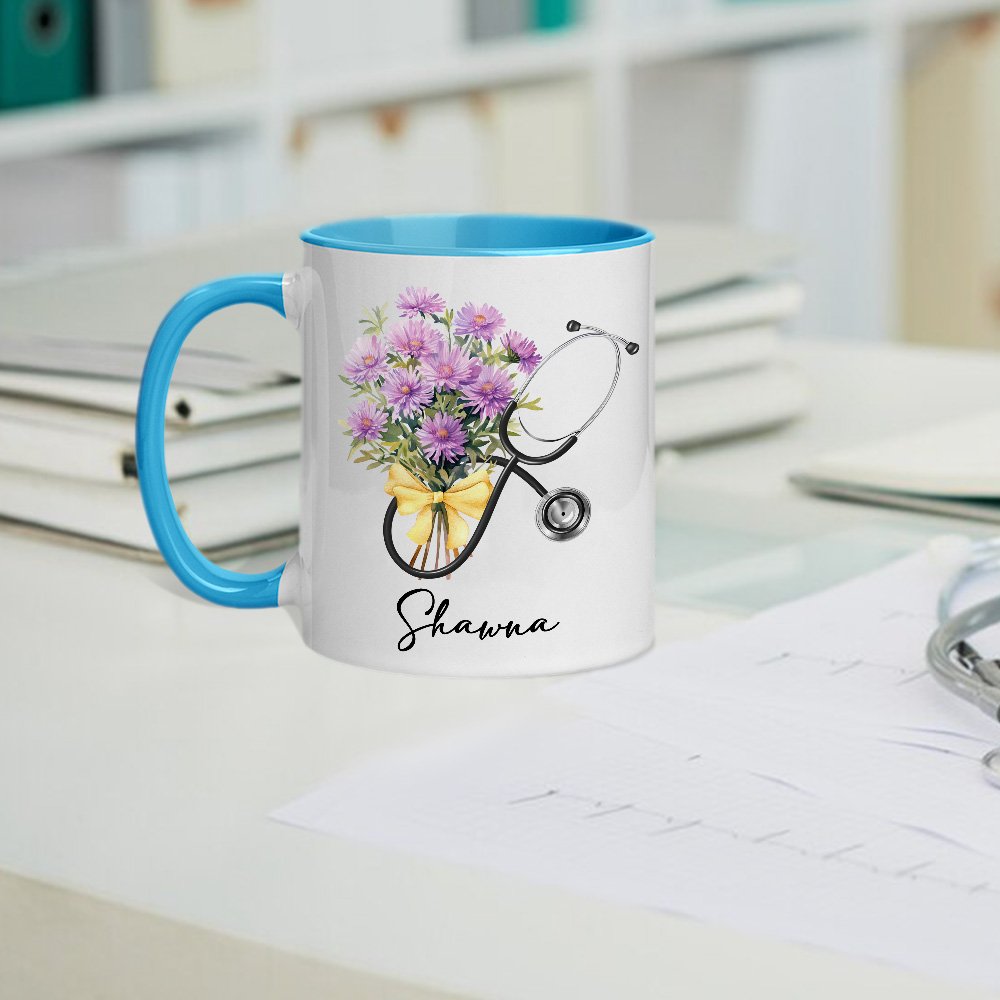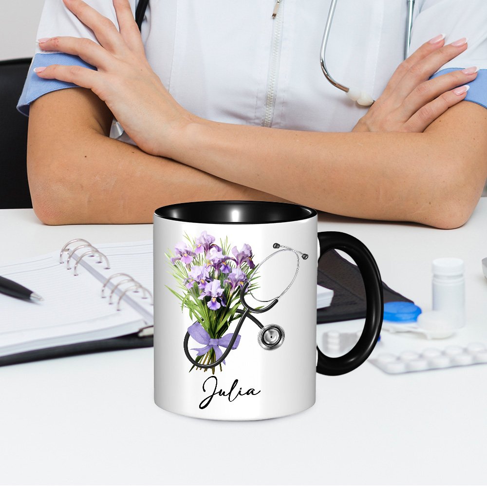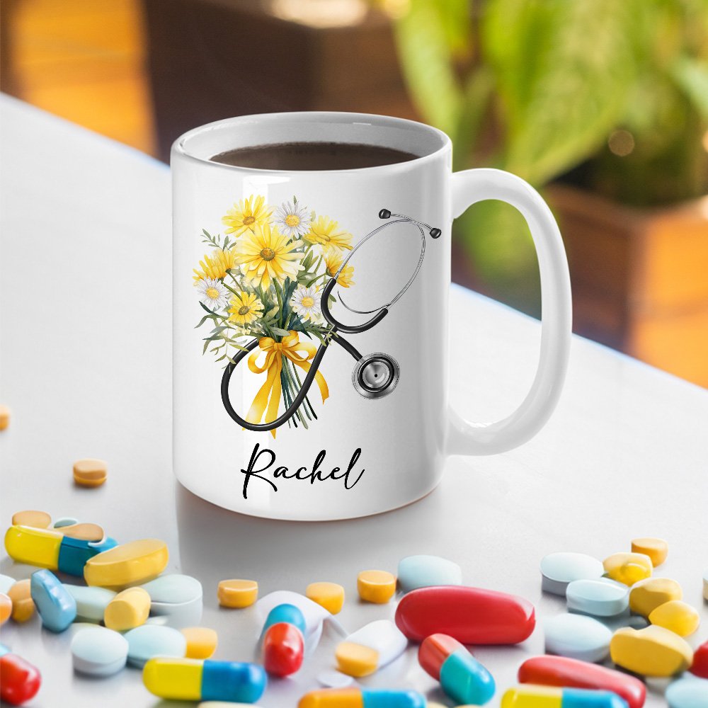 Deze 11 oz keramische koffiemok is speciaal ontworpen voor artsen en verpleegkundigen, met een charmant stethoscoopmotief verweven met kleurrijke geboortebloemen. De gepersonaliseerde naam voegt een speciaal tintje toe, waardoor het een perfect, attent cadeau is voor professionals in de gezondheidszorg. Het is niet zomaar een mok; het is een erkenning van hun toewijding en een dagelijkse herinnering aan hun belangrijke rol in de patiëntenzorg.