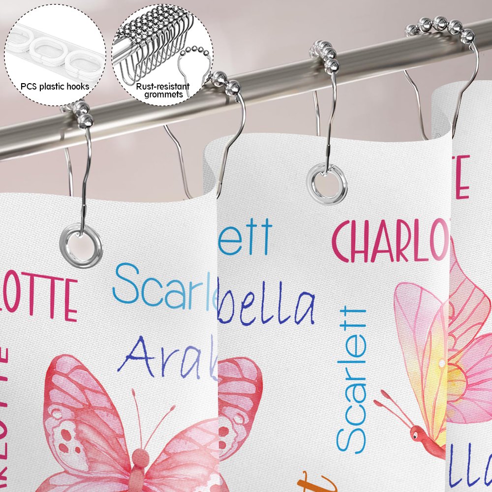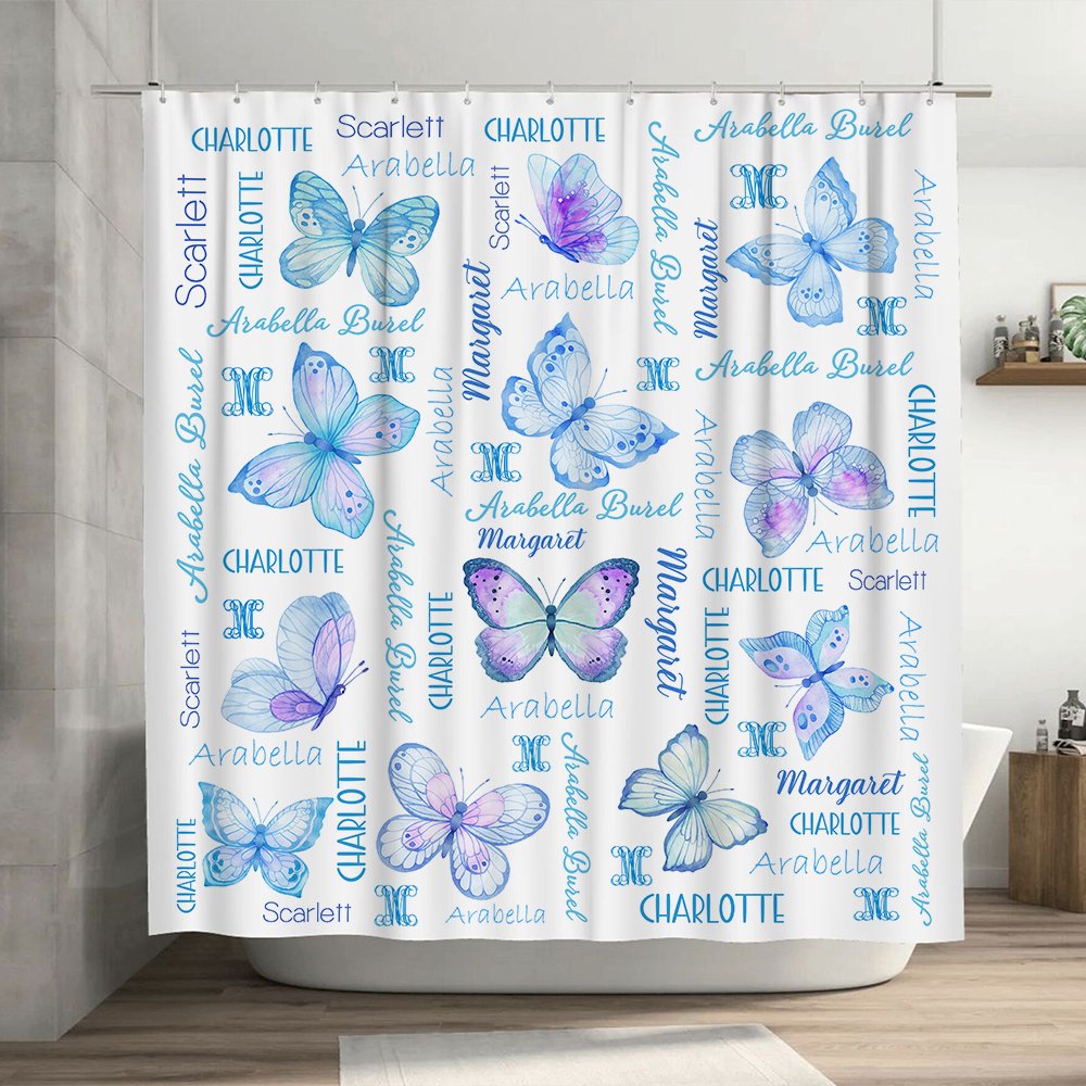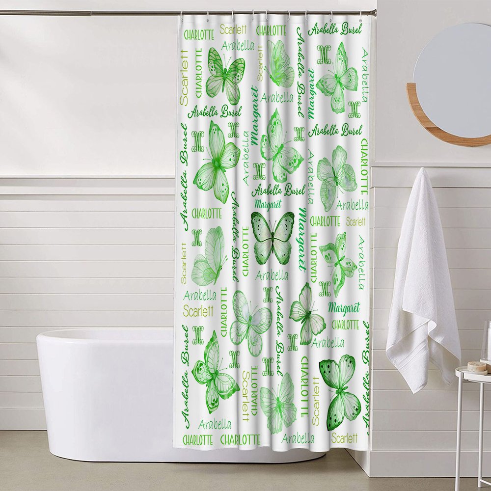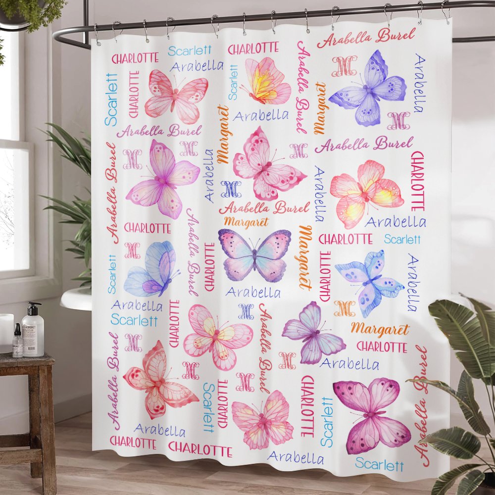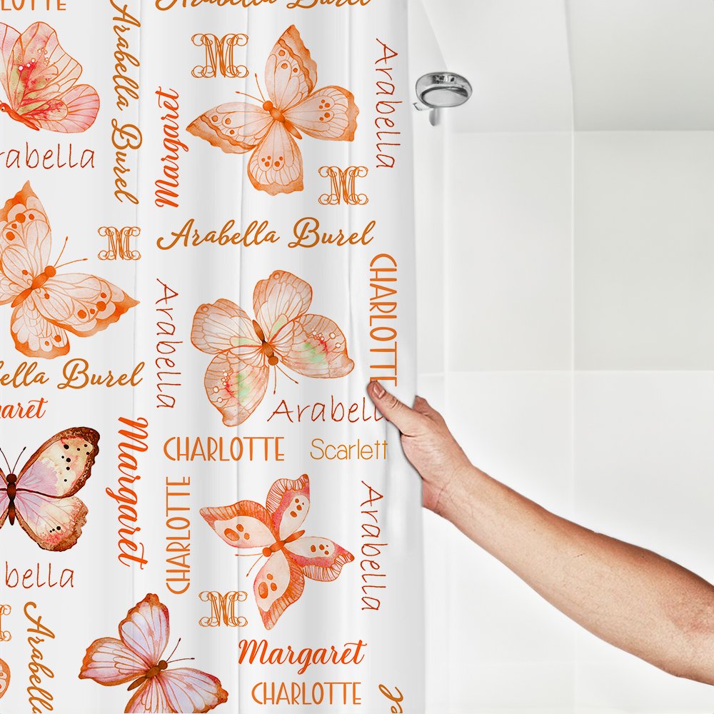 Dit gepersonaliseerde douchegordijn heeft een mooi en helder vlinderontwerp. Het is verkrijgbaar in verschillende kleuren - roze, rood, oranje, groen, blauw en paars - en kan ook worden aangepast met 1-5 namen, die worden weergegeven als een woordwolk, waardoor het nog unieker wordt.