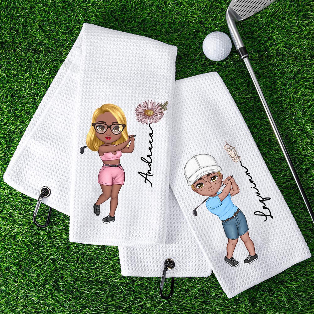 Deze golfhanddoek met wafelmotief heeft een schattig cartoonontwerp van een golfer en de optie om hem te personaliseren met een naam of geboortebloem. Dit persoonlijke tintje maakt het een opvallend accessoire voor elke golfliefhebber, zodat het net zo uniek is als de speler die het gebruikt.