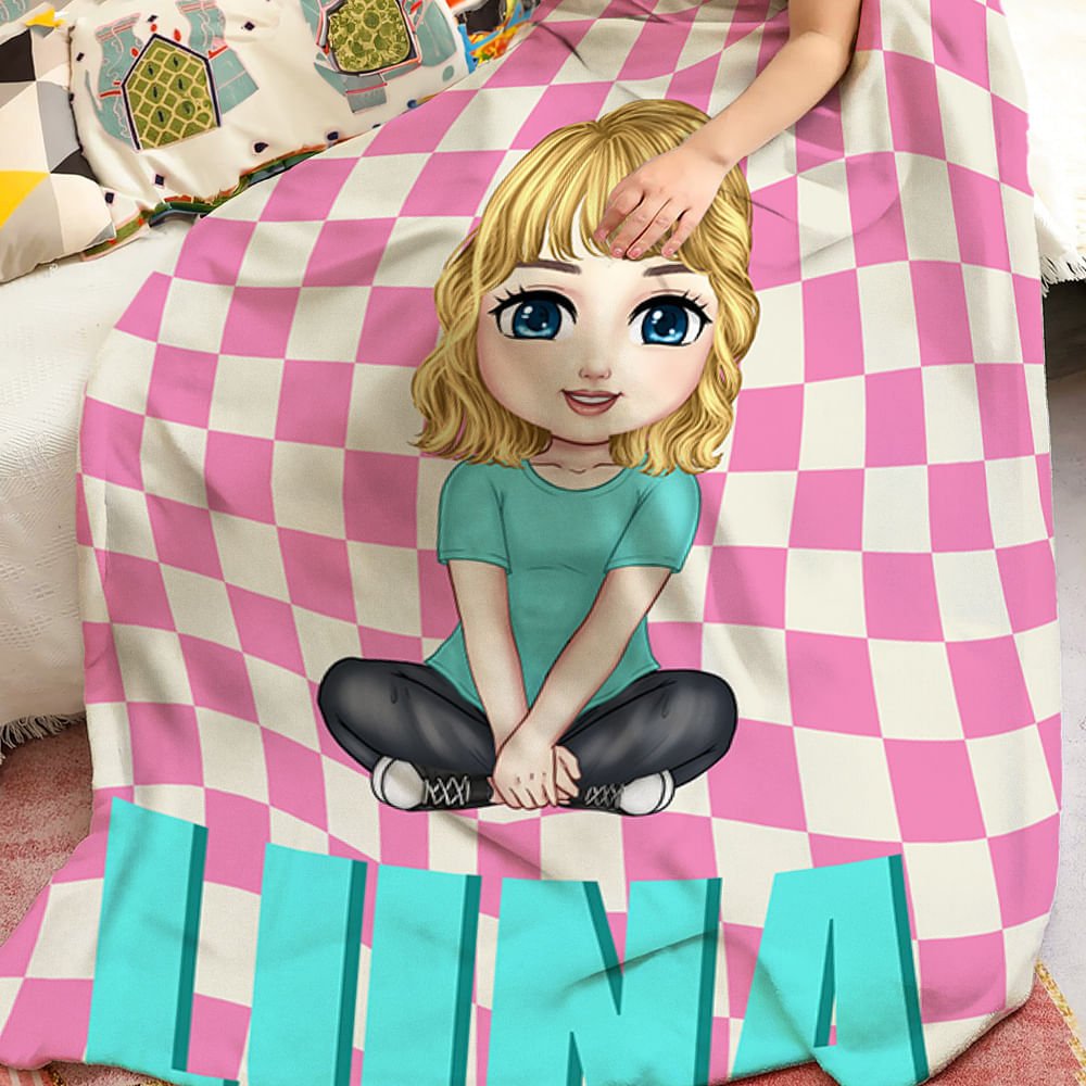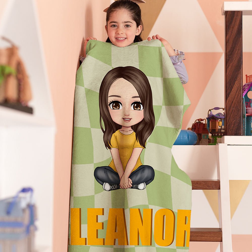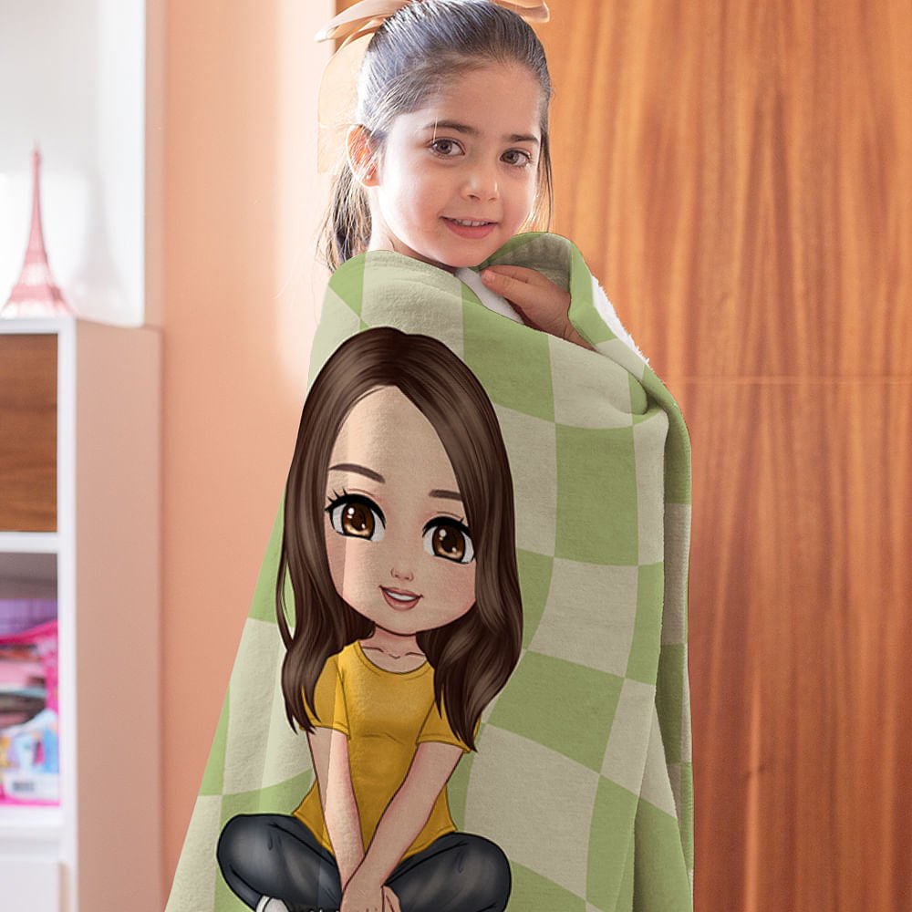 Deze deken is meer dan alleen een knus dekentje. Het is een unieke uitdrukking van jou, met een levendig meerkleurig dambordpatroon versierd met schattige stripfiguurtjes. En als je hem personaliseert met een schaduwnaam, wordt het echt een uniek aandenken.
