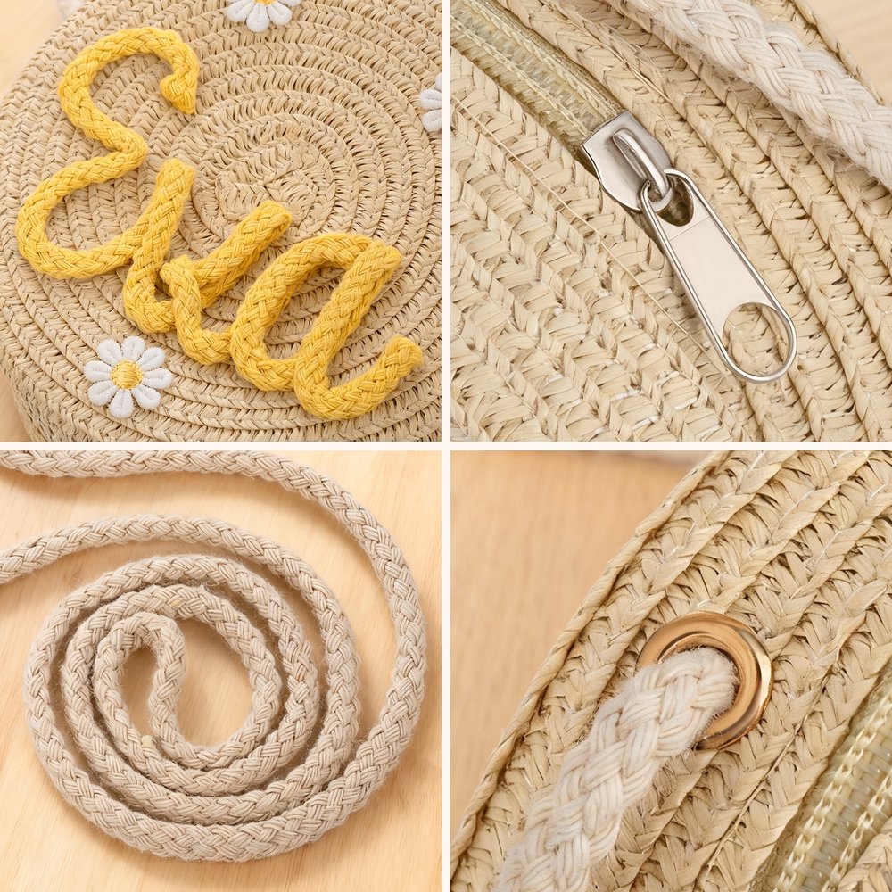 Deze ronde strozak heeft dromerige, zachte kleuren en een driedimensionale geweven textuur die een lichte en grillige sprookjessfeer creëert. Het oppervlak van de tas is zorgvuldig ontworpen met de naam van het kind en versierd met handgeschilderde madeliefjes. Dit is een slimme combinatie van natuurlijk kinderlijk plezier en een persoonlijk ontwerp voor een uniek accessoire waar kleine meisjes meteen verliefd op zullen worden.