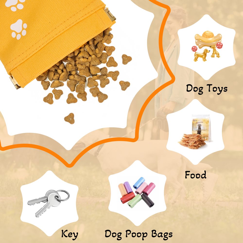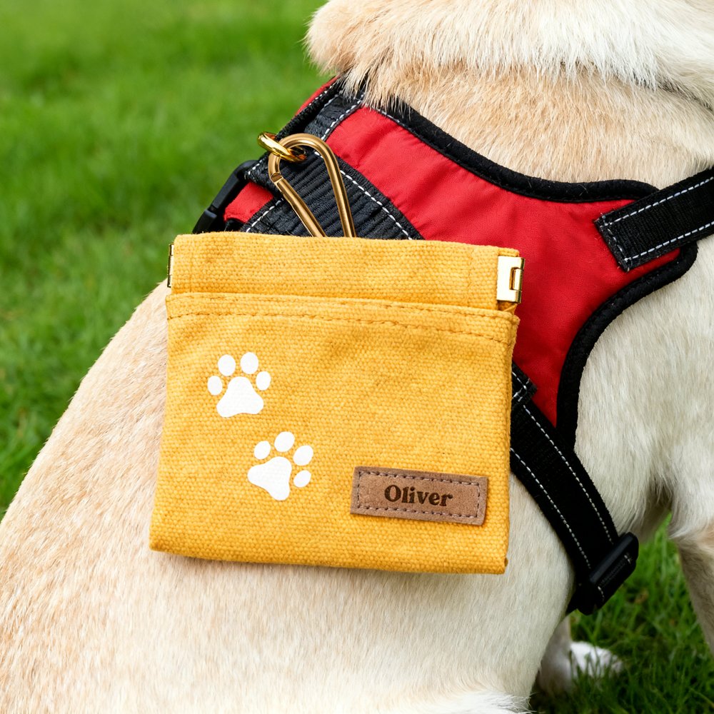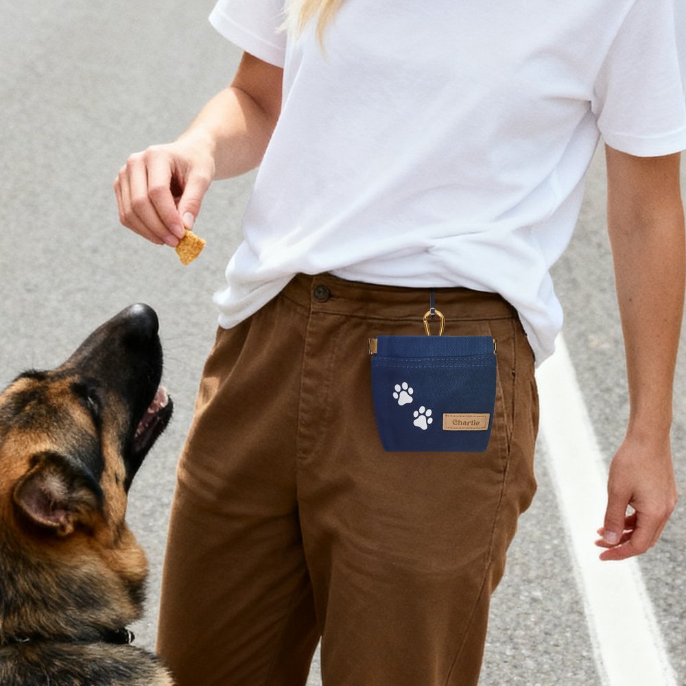 Dit zakje voor hondensnacks heeft een schattig ontwerp met een pootafdruk van een hond, zodat je de naam van je huisdier kunt aanpassen. Dit maakt het een uniek accessoire voor je harige vriend. Het wordt geleverd met een karabijnhaak voor eenvoudige bevestiging aan de riem of halsband.