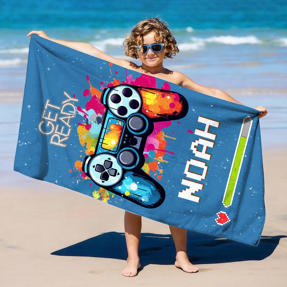 Dit strandlaken heeft een gamecontroller in graffitistijl als centraal ontwerpelement, gecombineerd met pixelachtige "GET READY"-tekst, gezondheidsbalken en hartpictogrammen in levendige en gedurfde kleuren. Je kunt verschillende achtergrondkleuren kiezen en een eigen naam toevoegen, zodat je een strandlaken vol persoonlijkheid en trendy uitstraling krijgt.