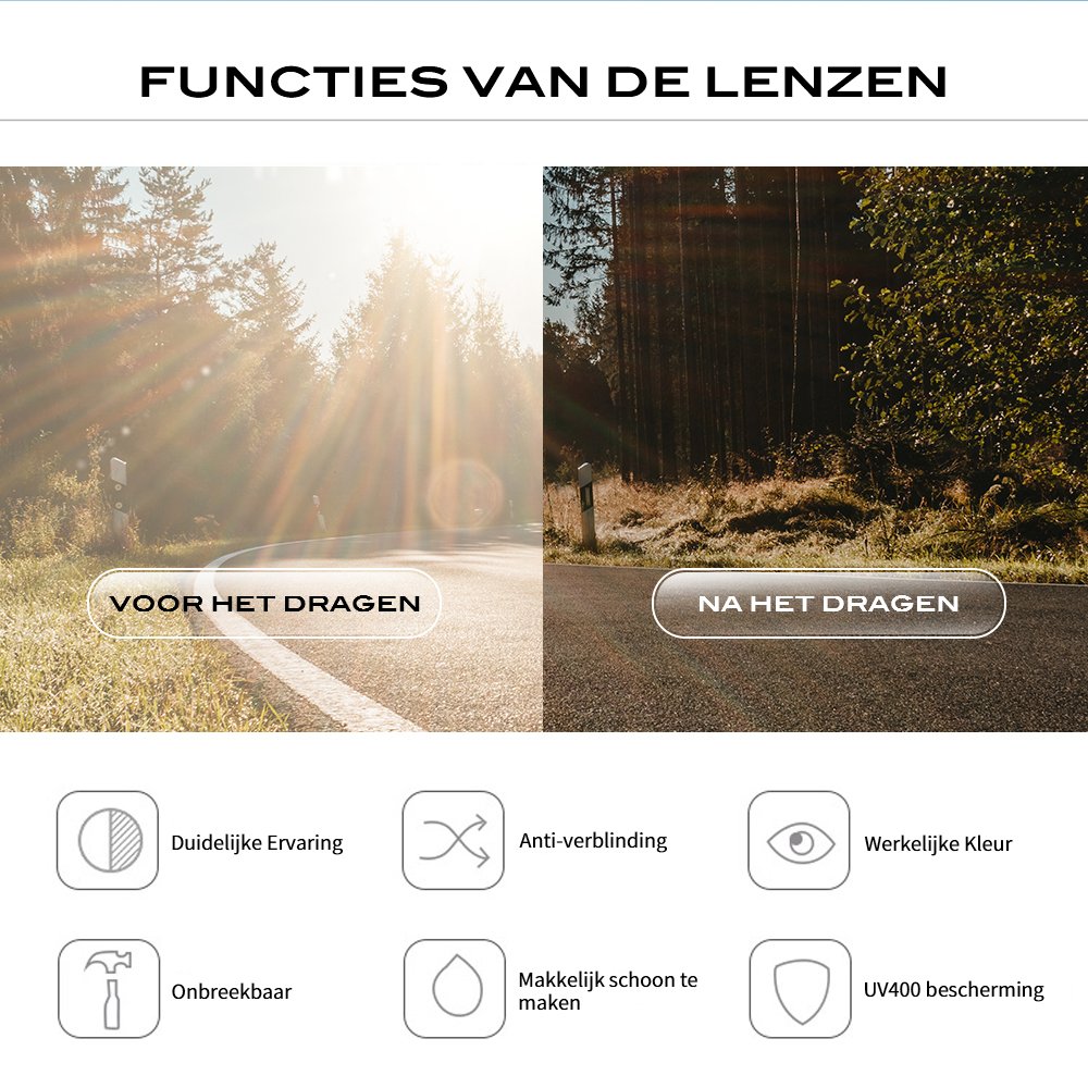 Het montuur is gemaakt van milieuvriendelijk PC plastic, is licht en duurzaam en heeft een uitzonderlijke weerstand tegen krassen en stoten. Met eersteklas TAC-lenzen vermindert deze zonnebril effectief schittering van wegen, water en sneeuw, terwijl hij betrouwbare UV-bescherming biedt tegen direct zonlicht tijdens buitenactiviteiten.