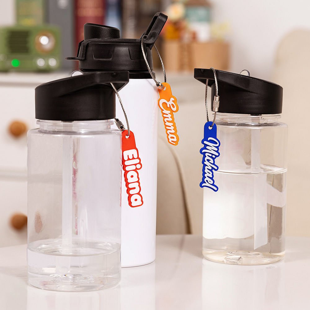 Dit tuimeltasje kan worden aangepast met een naam en achtergrondkleur. Het is opvallend, trendy en eenvoudig, waardoor het een opvallende accessoire is voor elke waterfles of tas.