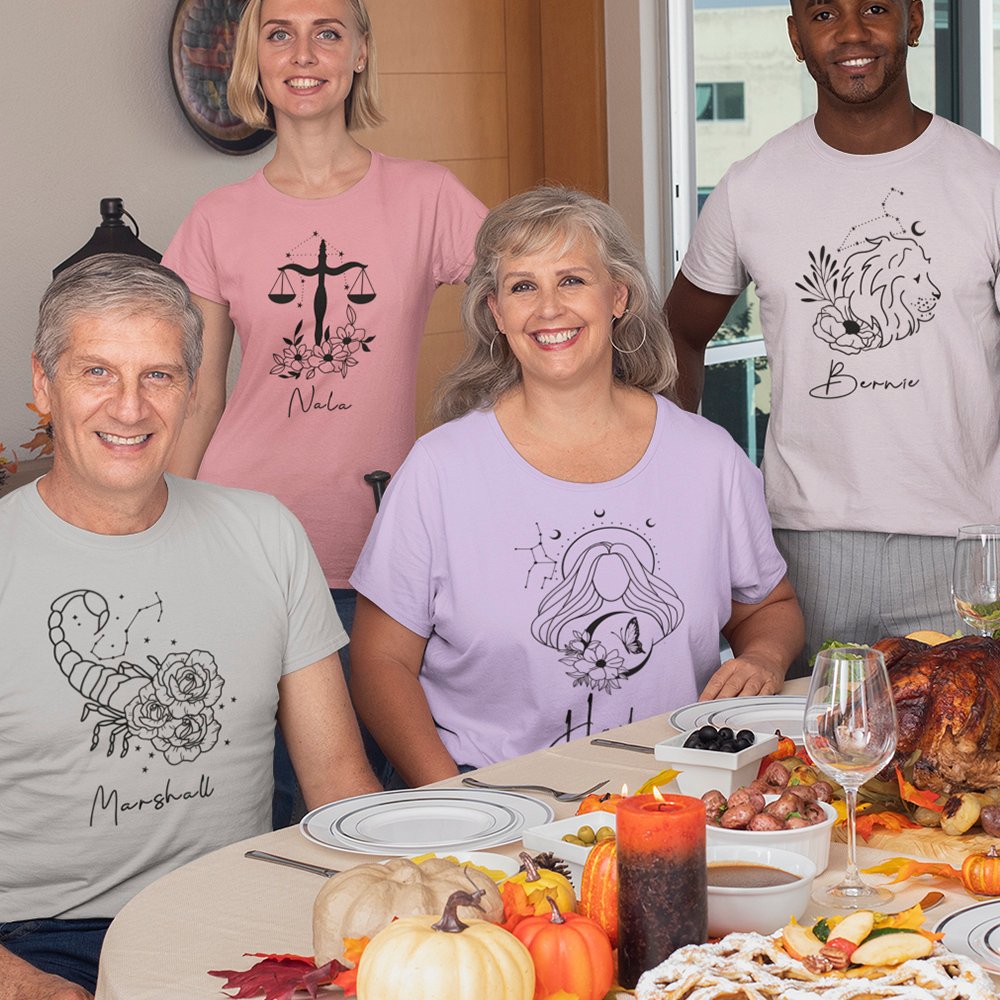 Dit gepersonaliseerde meerkleurige T-shirt van puur katoen heeft een uniek ontwerp. Op de voorkant staat een patroon dat de 12 dierenriemtekens voorstelt en de stijl is eenvoudig en opvallend. Je kunt de kleur van de kleding kiezen en je naam aanpassen om een speciaal T-shirt voor je persoonlijkheid en verjaardag te maken.