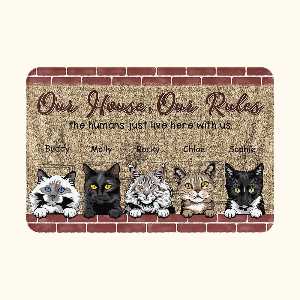 De zin "My House My Rules The Humans Just Live Here With Me" toont de humor en het plezier van huisdieren en hun baasjes. Print deze unieke zin op de mat met de exclusieve naam van je huisdier om de schattigheid van je huisdier en de liefde van de eigenaar voor je huisdier voor altijd te koesteren.