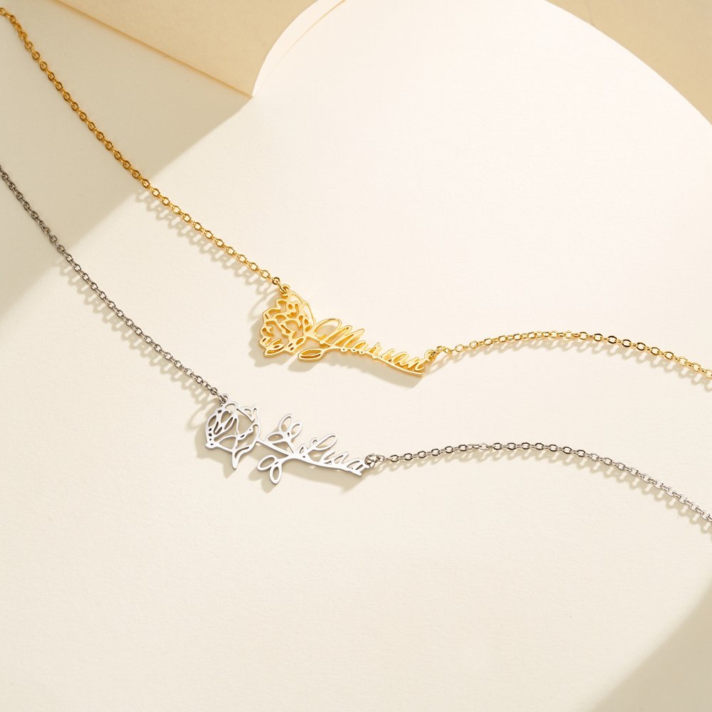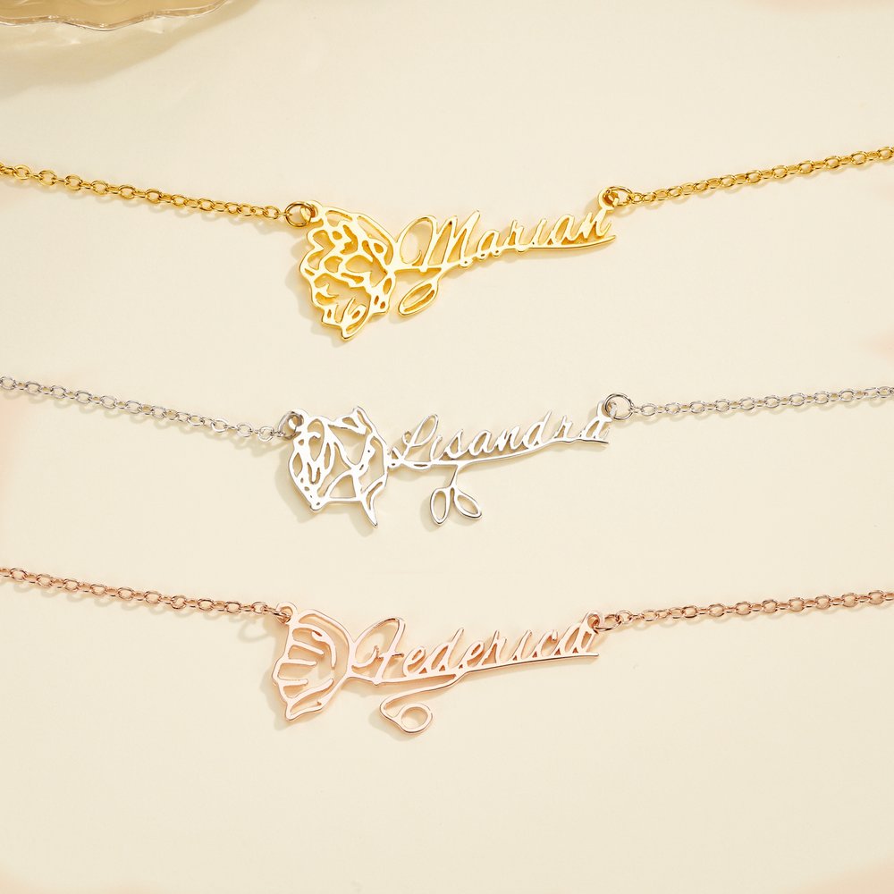 De ontwerpinspiratie achter deze betoverende ketting is ontleend aan de schoonheid van de natuur en de ingewikkelde details die in elke bloem te vinden zijn. Je kunt een geboortebloem kiezen of gewoon de bloem waar ze van houden. Onze vakbekwame ambachtslieden zullen je bloem perfect laten samensmelten met de naam om van deze ketting een buitengewone manier te maken om persoonlijkheid te vieren.