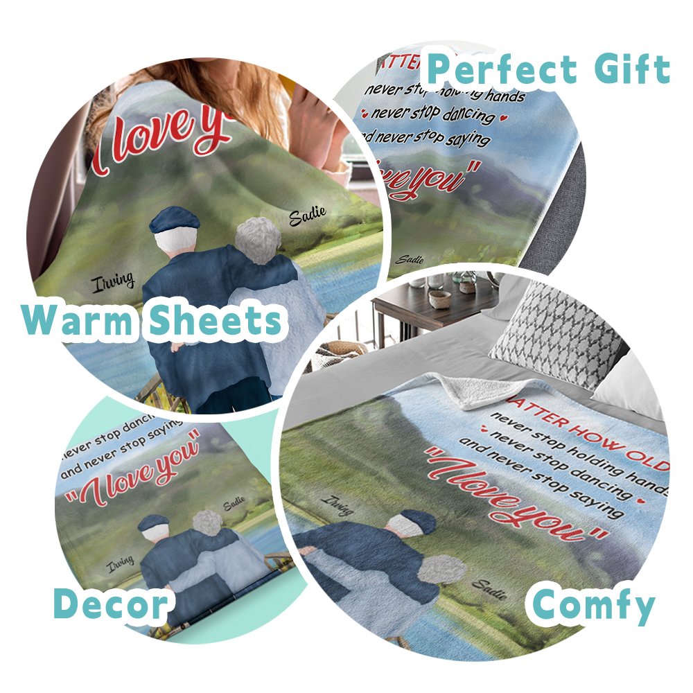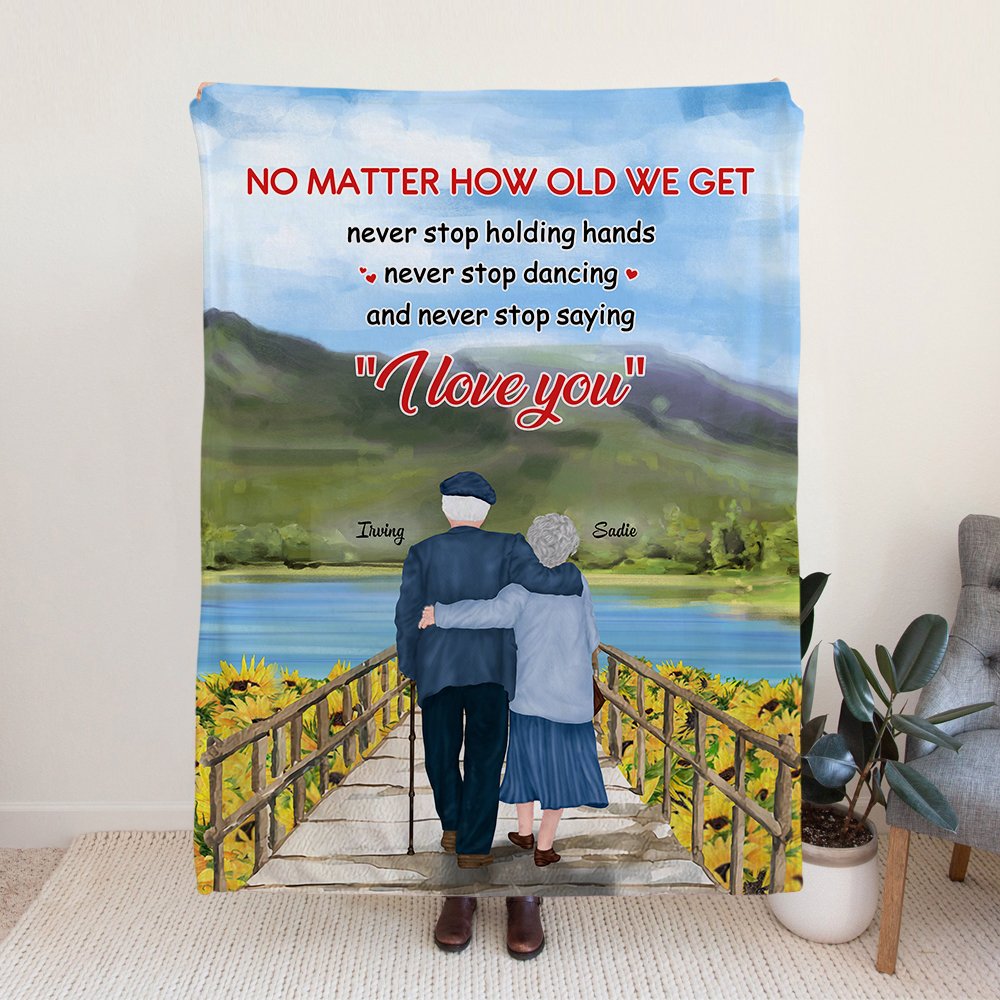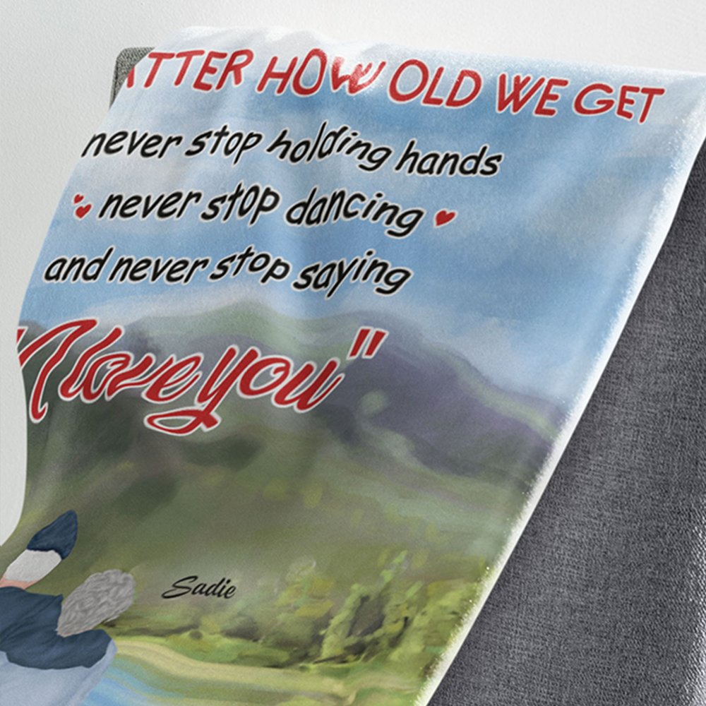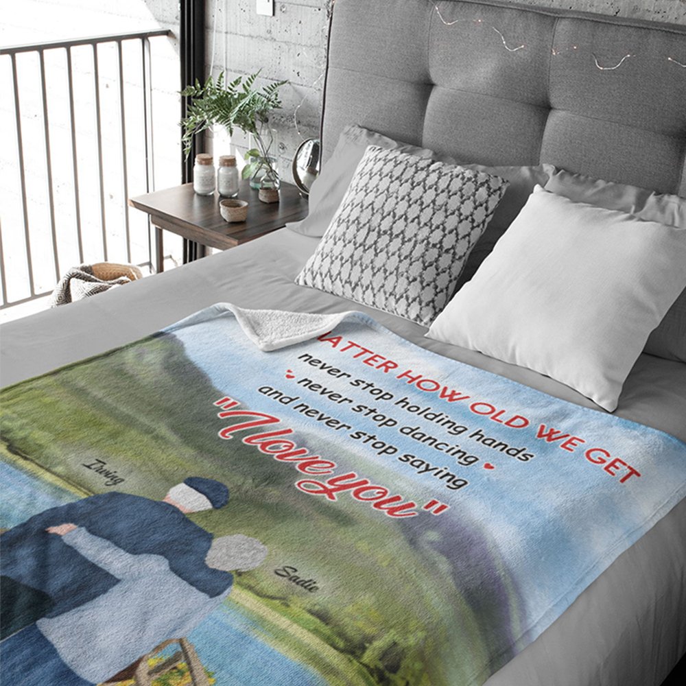 De "No Matter How Old We Get Never Stop Holding Hands" quote viert de onbreekbare liefde die je deelt met je geliefde. Laat deze romantische liefde voor altijd duren door romantische citaten op de deken te drukken en hem aan te passen met jullie namen.