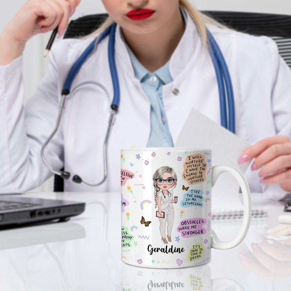 Deze witte keramische mok is het perfecte cadeau voor verpleegkundigen die een dagelijkse dosis motivatie en positiviteit nodig hebben. De mok is volledig bedrukt met opbeurende affirmaties die hun geest een boost kunnen geven en hen de hele dag gemotiveerd kunnen houden. Het beste deel is dat de mok kan worden aangepast met de naam van de verpleegkundige, waardoor het nog specialer wordt.