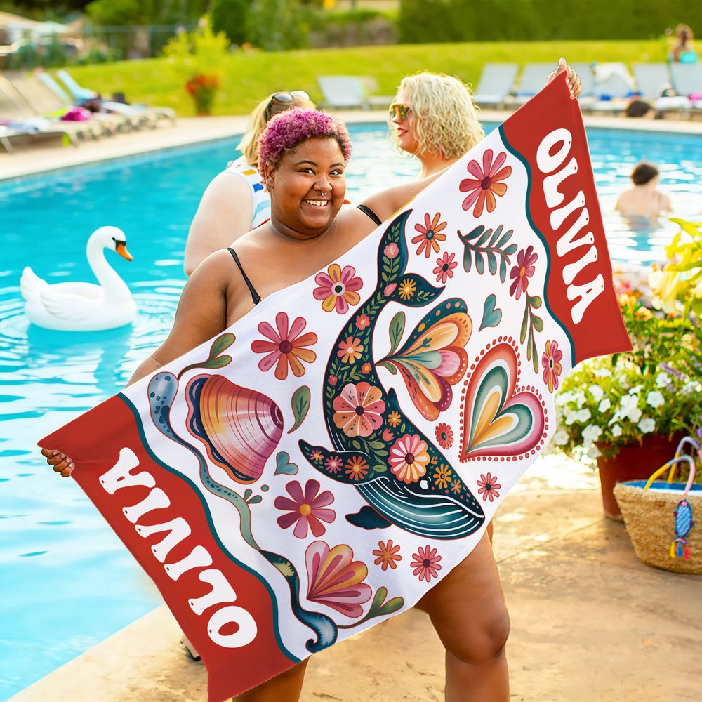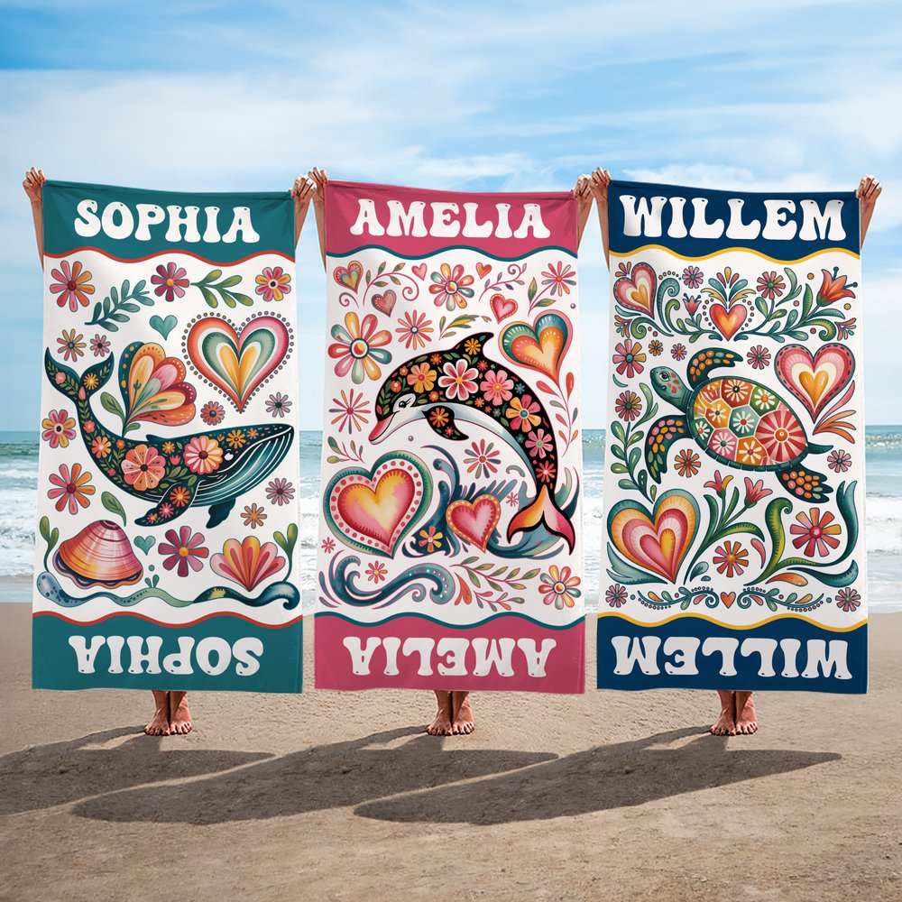 Je kunt een uniek strandlaken samenstellen door een levendige achtergrondkleur te kiezen en je naam toe te voegen. De voorkant heeft een speels aquarelontwerp van zeedieren, waardoor een praktisch strandlaken verandert in een persoonlijk cadeau dat de liefde voor de oceaan en zomeravonturen viert.