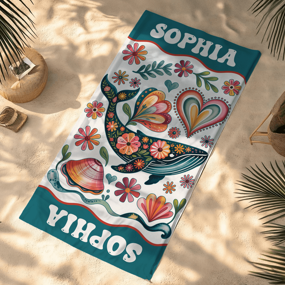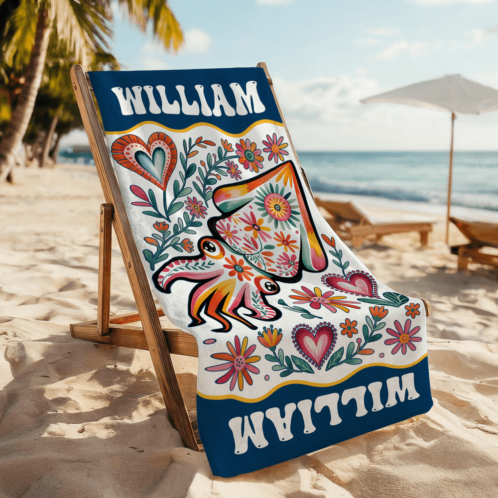 Je kunt een uniek strandlaken maken door een levendige achtergrondkleur te kiezen en een eigen naam toe te voegen. De voorkant heeft een grillig aquarelontwerp van zeedieren, waardoor een praktisch strandlaken een persoonlijk eerbetoon wordt dat de liefde van uw kind voor de oceaan en zomeravonturen viert.