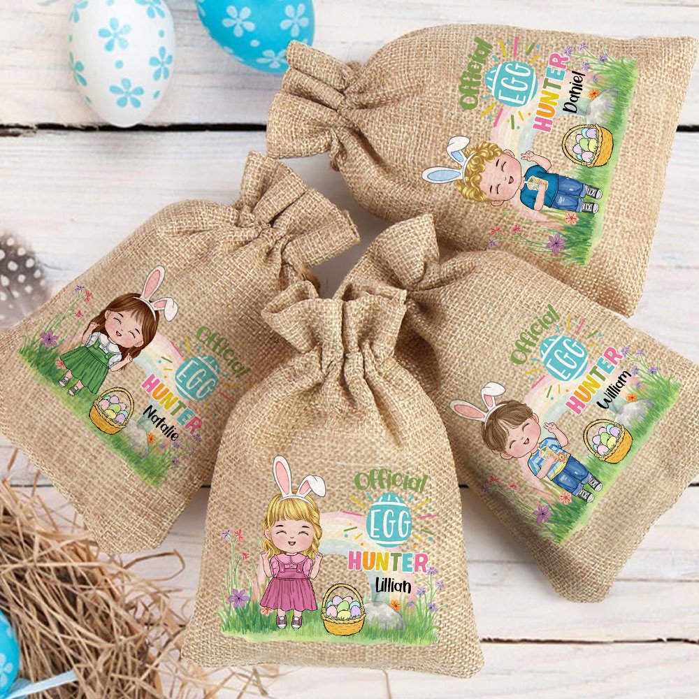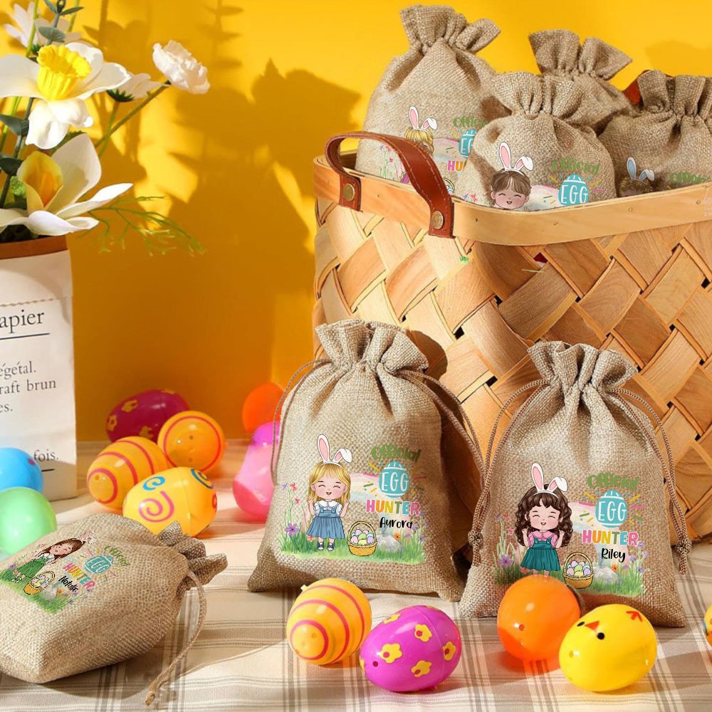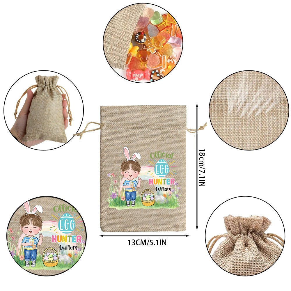 Gepersonaliseerde Officiële Ei Jager Cartoon karakter koord Burlap traktatie zak met naam Pasen partij Favor Gift voor jongens meisjes