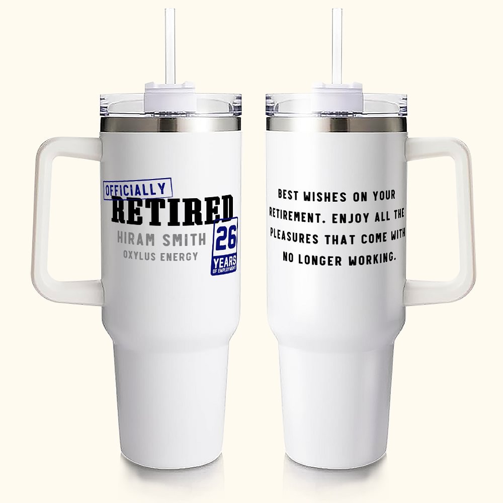 Vier een speciale mijlpaal met deze op maat gemaakte beker! Je kunt de beker personaliseren met de naam van de gepensioneerde, de naam van het bedrijf, het aantal dienstjaren en een welgemeende boodschap, zodat het een uniek en betekenisvol cadeau wordt. Perfect om waardering te tonen voor hun toewijding en harde werk door de jaren heen.