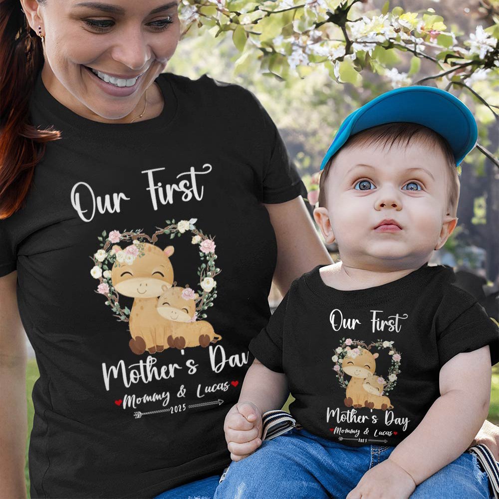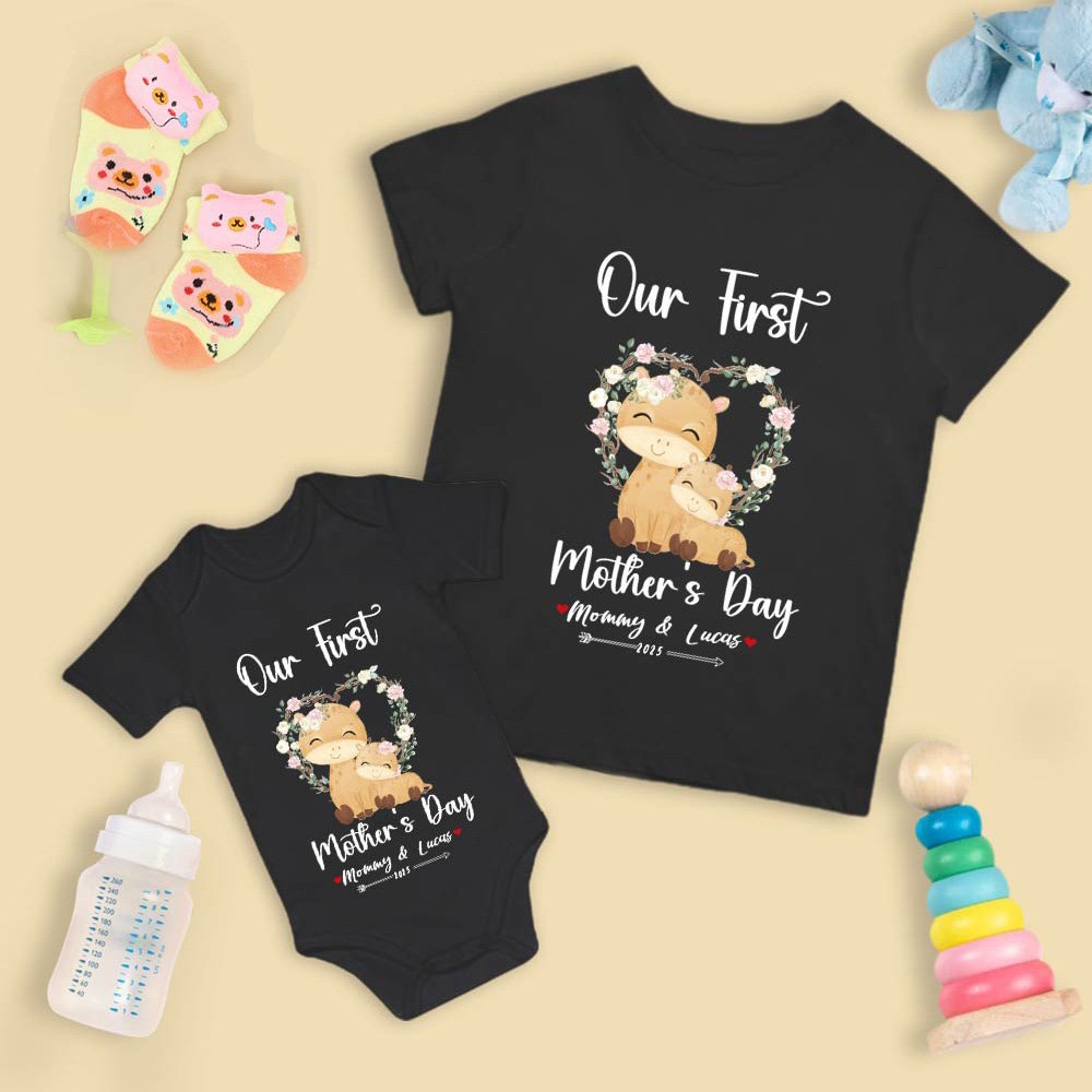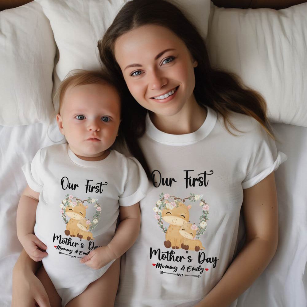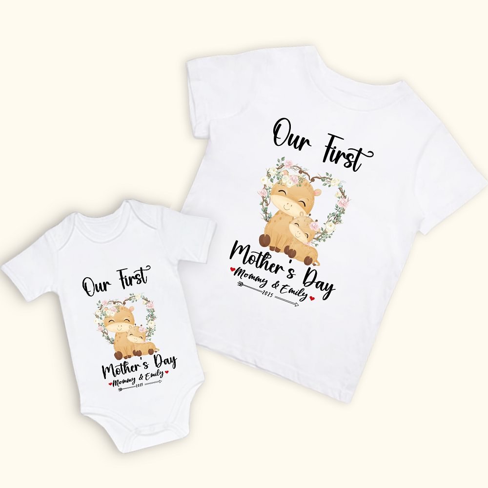 Maak deze eerste Moederdag extra speciaal met ons gepersonaliseerde giraffe mama T-shirt en baby onesie. Schattige giraffe omringd door bloemen op kleding. Het T-shirt en de onesie hebben beide 3 kleuren om uit te kiezen. Personaliseer deze kleertjes met mama- en babynamen en een jaartal om deze speciale dag te vieren.