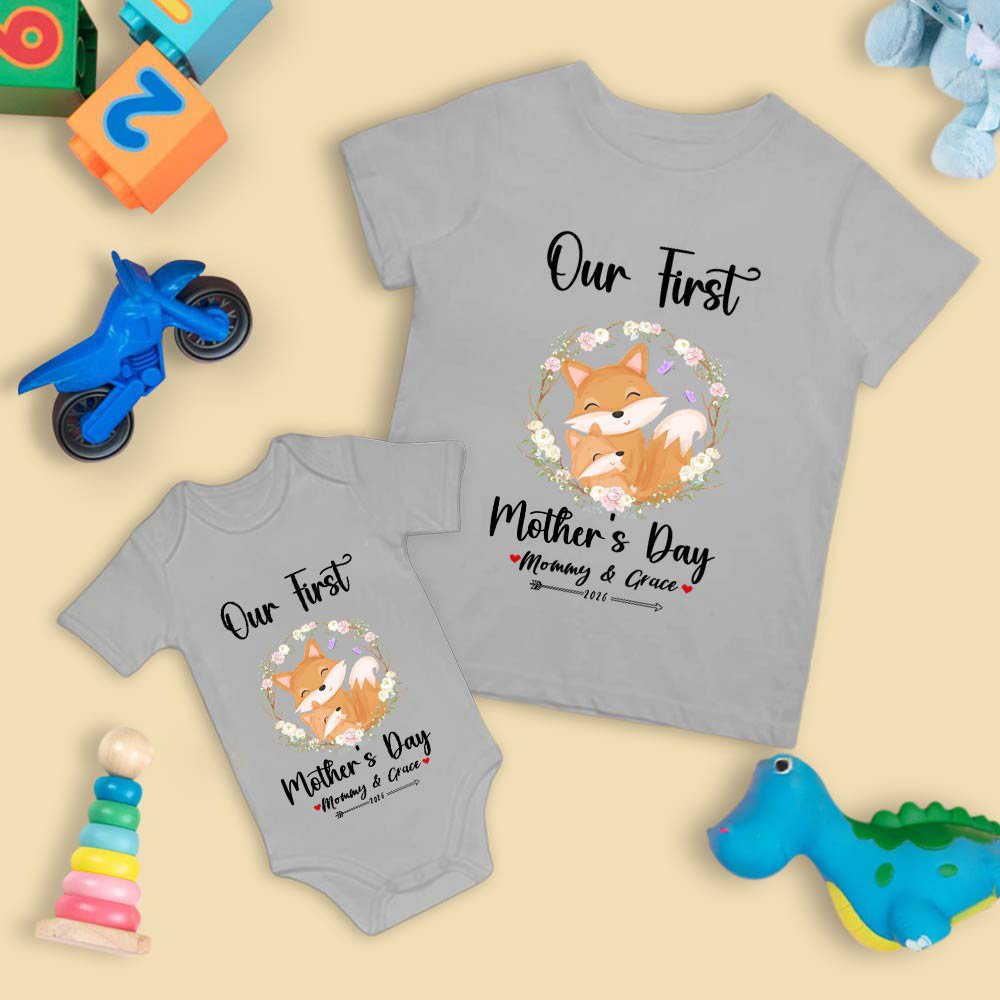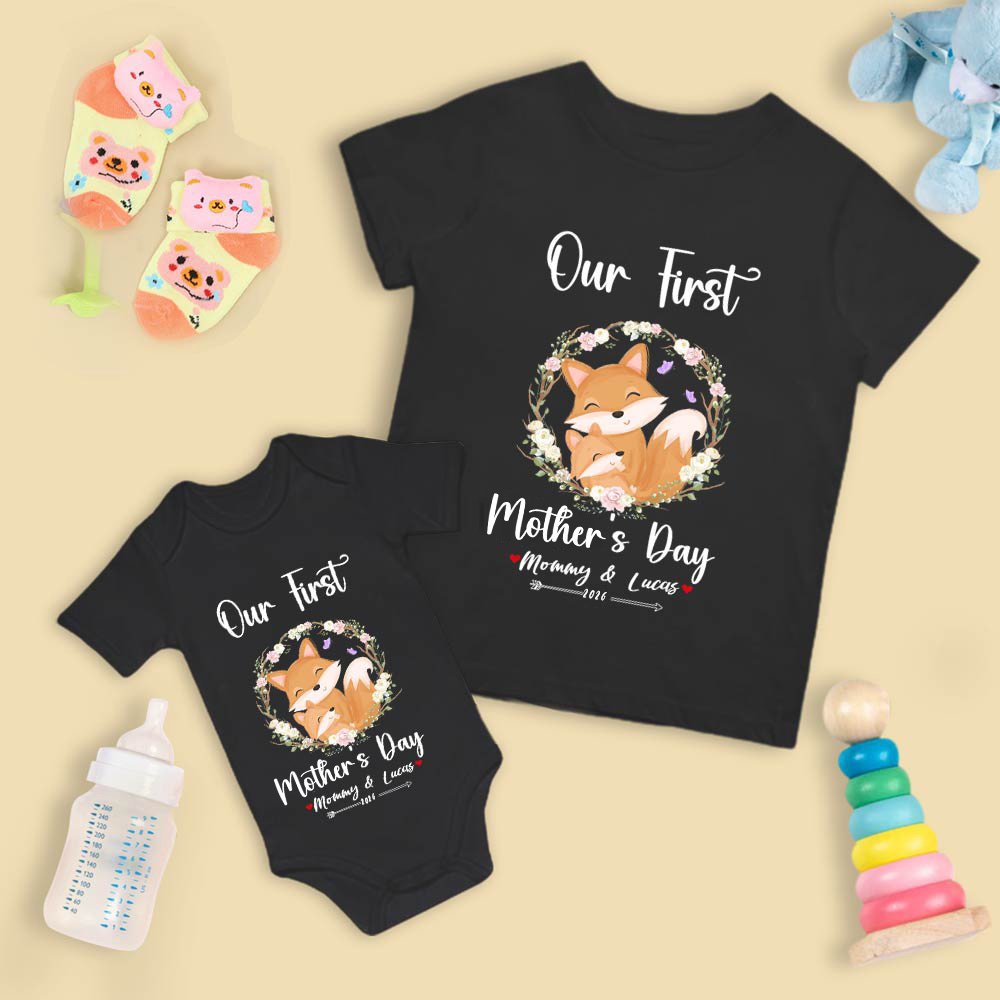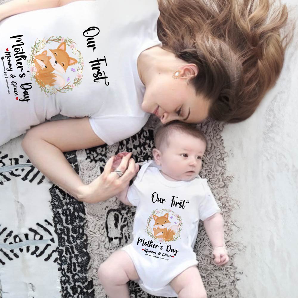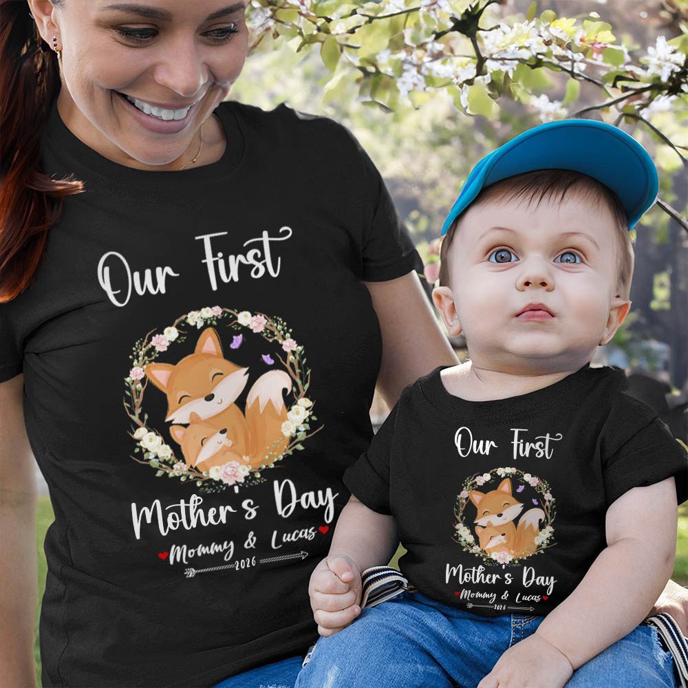 Onze kledingstukken zijn ontworpen met een schattig ouder-kind vosje als ontwerpelement. Binnenin de krans ligt de babyvos geknuffeld in de armen van de moeder, en de afbeelding is prachtig warm en gezellig, als een manier om de liefde tussen moeder en kind uit te drukken, en met de feestelijke tekst "Onze eerste Moederdag", die de feestelijke sfeer sterker en warmer maakt. We bieden de optie om de naam van jou en je kind toe te voegen aan de voorkant van het kledingstuk, dit maatwerk voegt een persoonlijk tintje toe en maakt het kledingstuk betekenisvoller.
