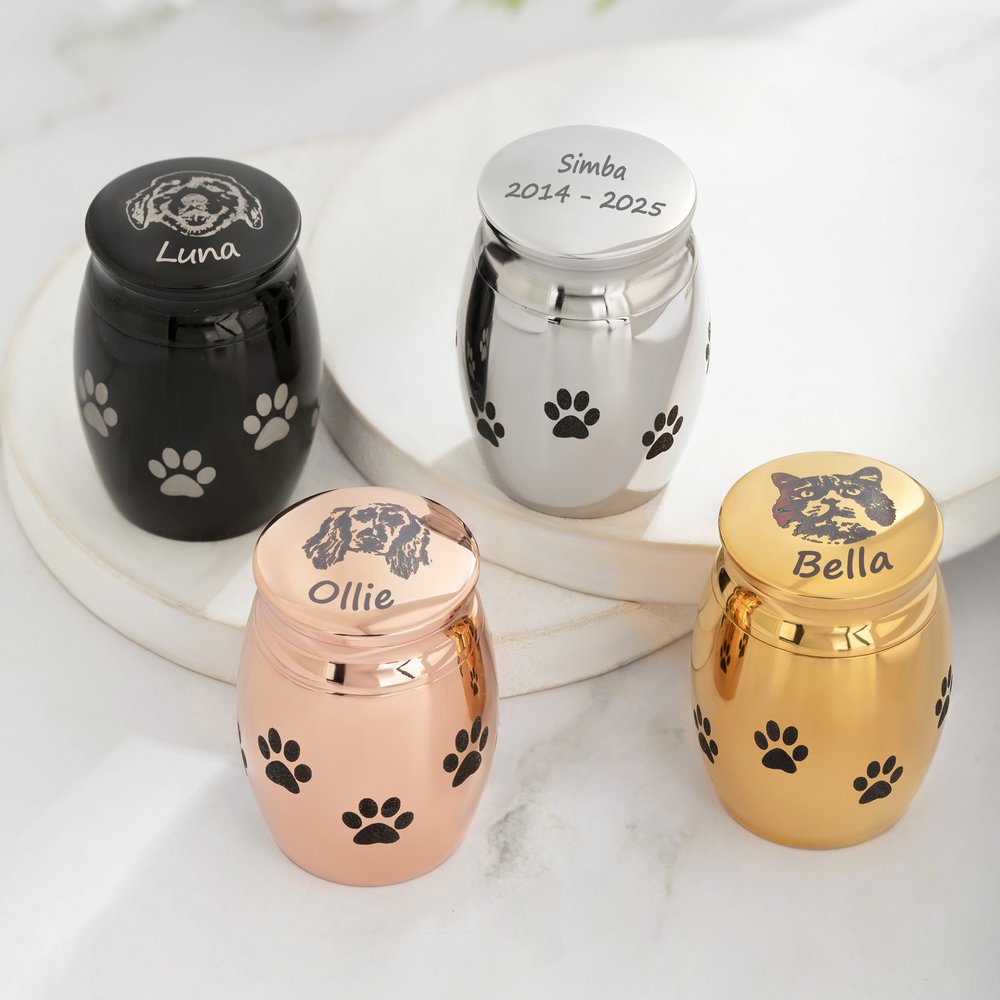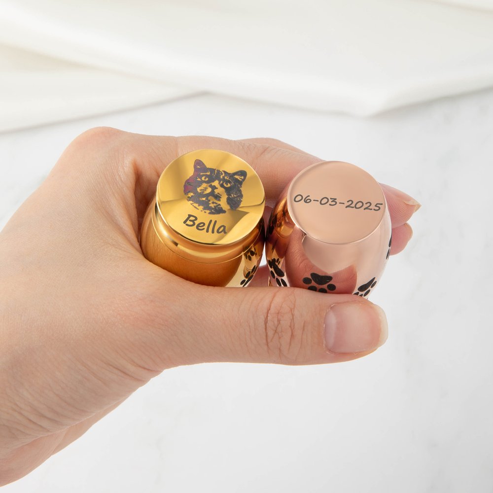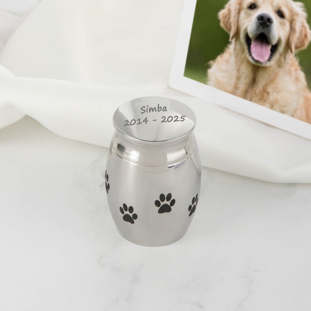 Deze mini-urn is met zorg gemaakt en versierd met een hondenpootafdruk. De buitenkant heeft een gladde, glanzende afwerking. U kunt de urn laten personaliseren met een naam, een korte tekst en zelfs een foto van uw huisdier, waardoor het een uniek en dierbaar aandenken wordt. Het is meer dan alleen een urn – het is een liefdevolle manier om uw trouwe metgezel te gedenken.