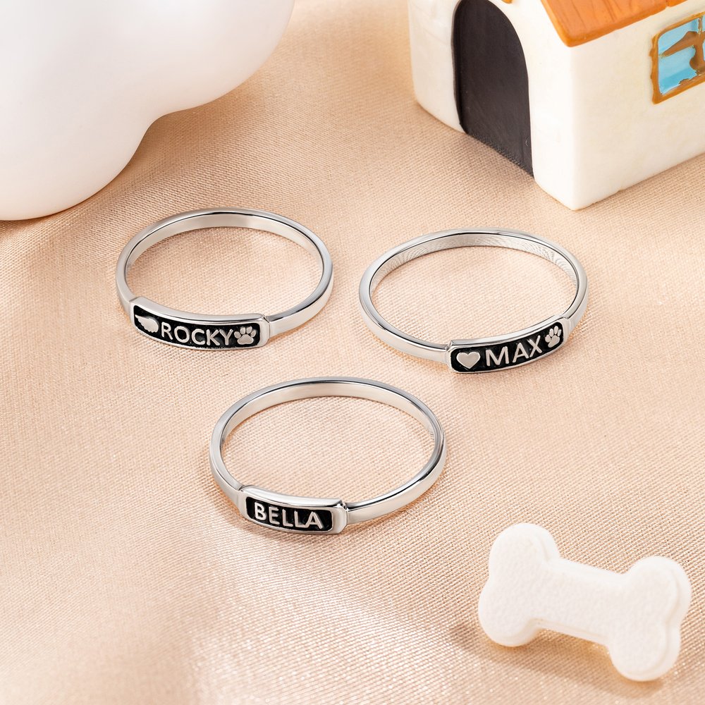 Deze ring combineert hartverwarmende symbolen en vakmanschap. Deze ring heeft de opties van een hart, engelenvleugels of pootafdruk naast de naam van je geliefde huisdier. Elke ontwerpkeuze resoneert met de diepe band tussen huisdieren en hun baasjes, waardoor het een gedenkwaardig aandenken wordt.