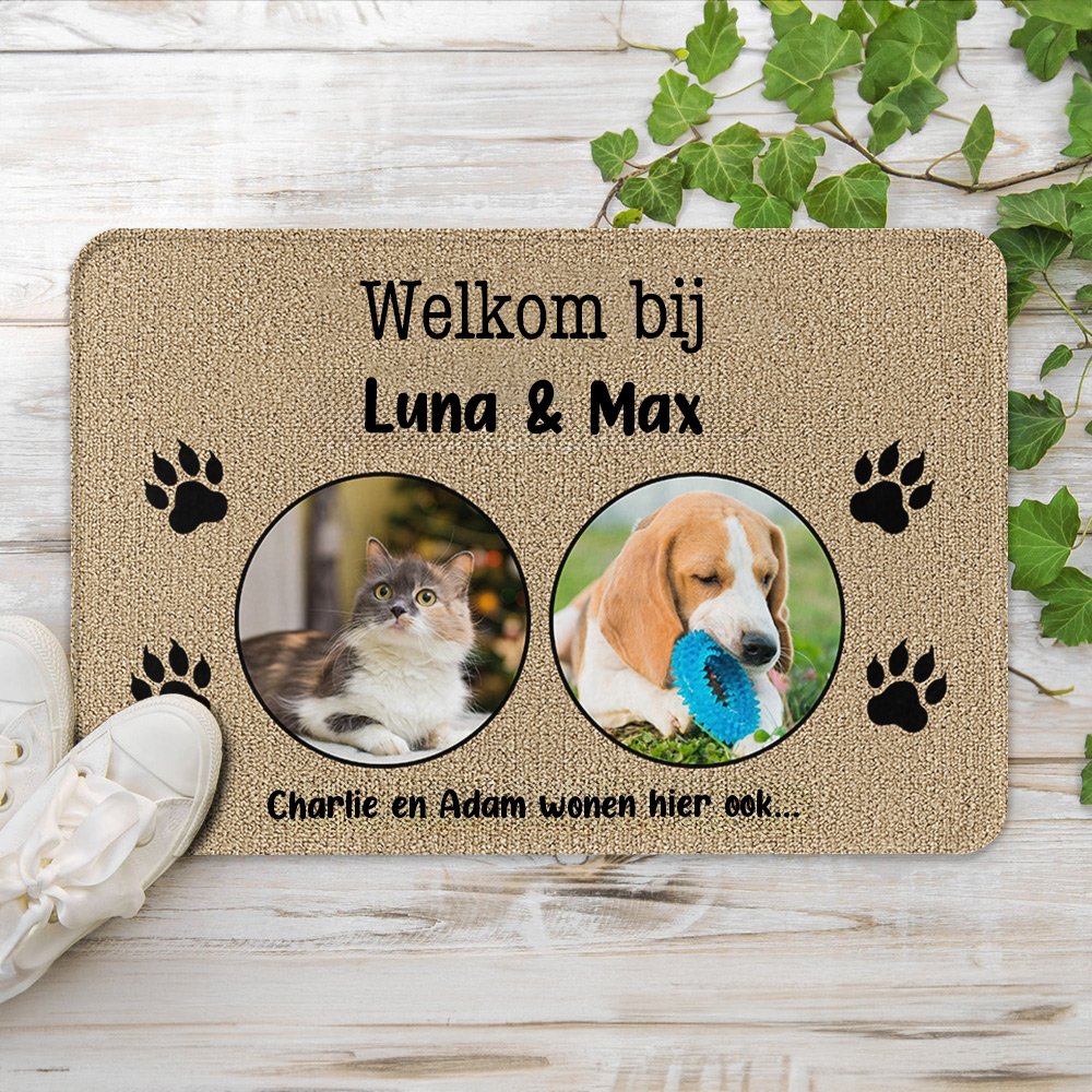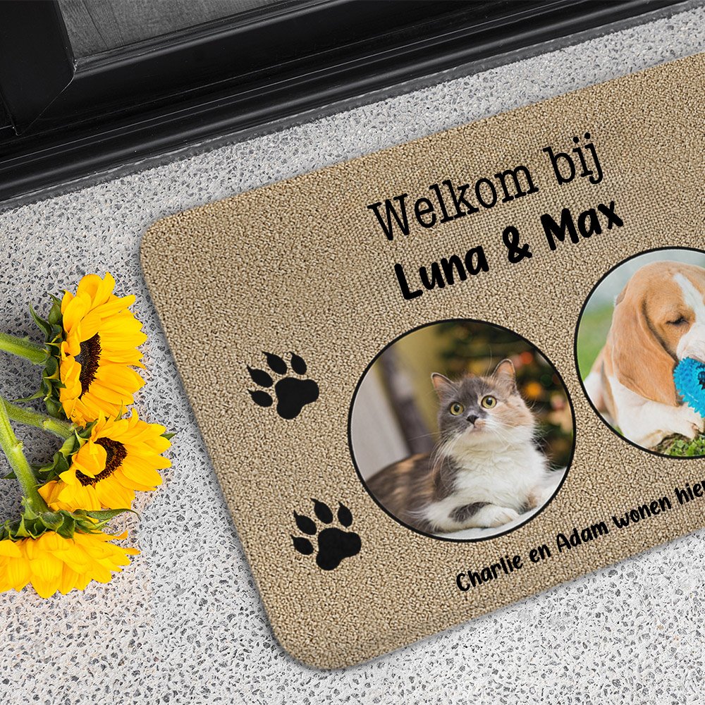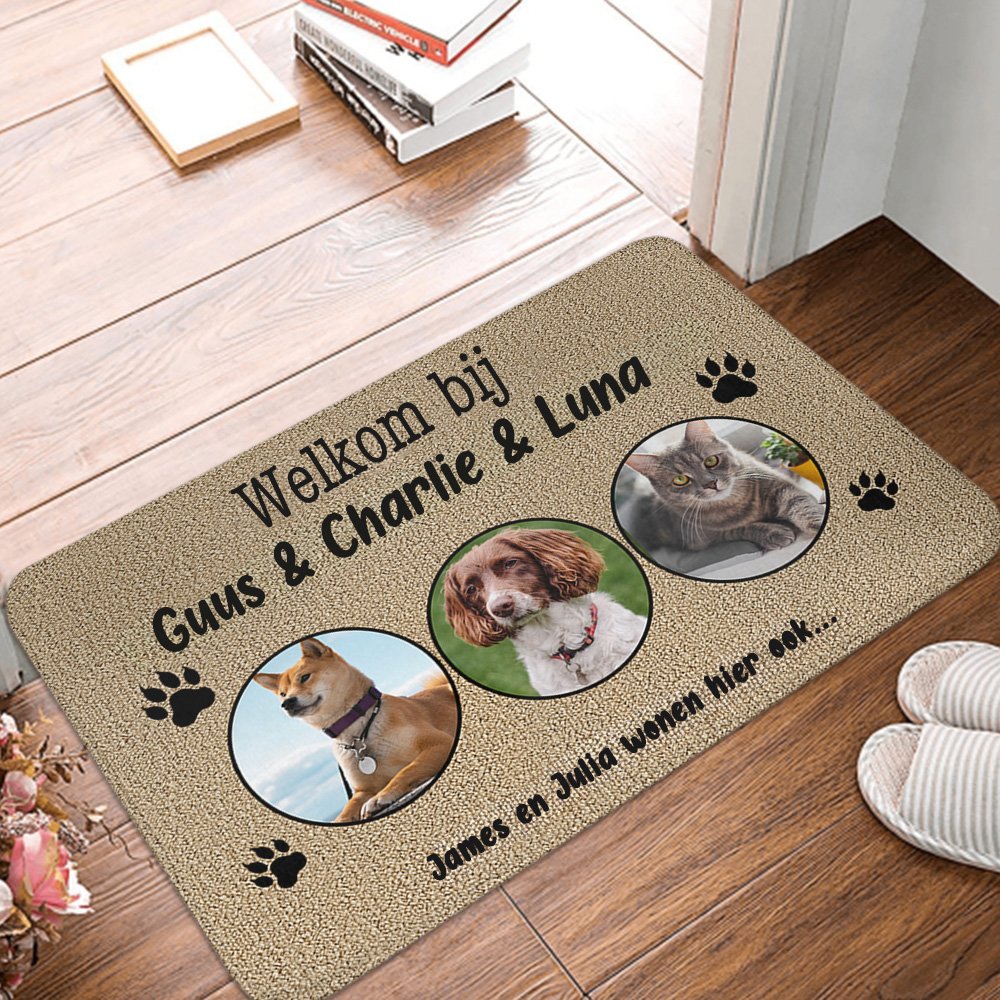 Deze deurmat kan worden aangepast aan uw wensen van 1-3 foto's van huisdieren, om u te helpen u goede herinneringen met huisdieren vast te leggen. Gepersonaliseerde tekst laat iedereen die uw huis betreedt uw warmte en vriendelijkheid ervaren. Er staan schattige pootafdrukken op de deurmat en u kunt ook de naam van uzelf en uw huisdier erop laten drukken om hem nog specialer te maken. De mat is verkrijgbaar in verschillende maten voor verschillende ruimtes en behoeften.