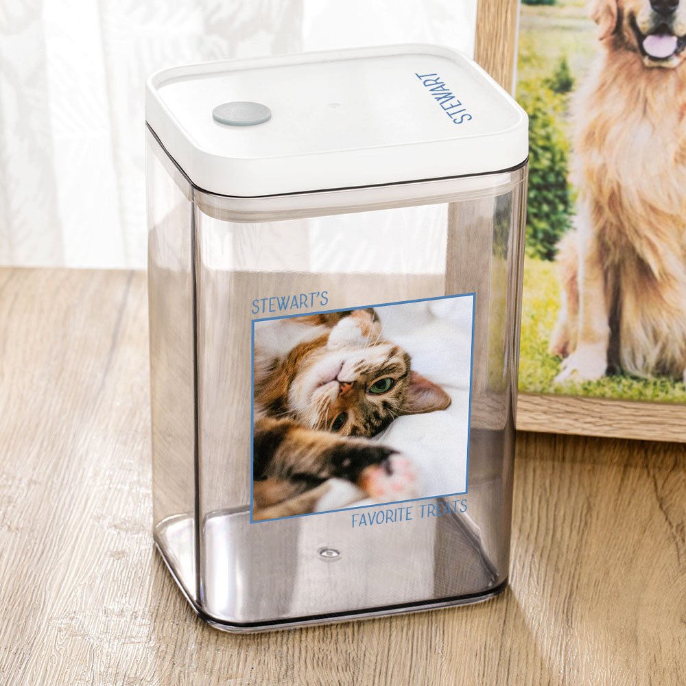 Deze gepersonaliseerde doorzichtige traktatiepot is het ideale cadeau voor mama's, papa's en dierenliefhebbers. Het kan worden aangepast met een foto en de naam van het geliefde huisdier, waardoor het cadeau een persoonlijk tintje krijgt.