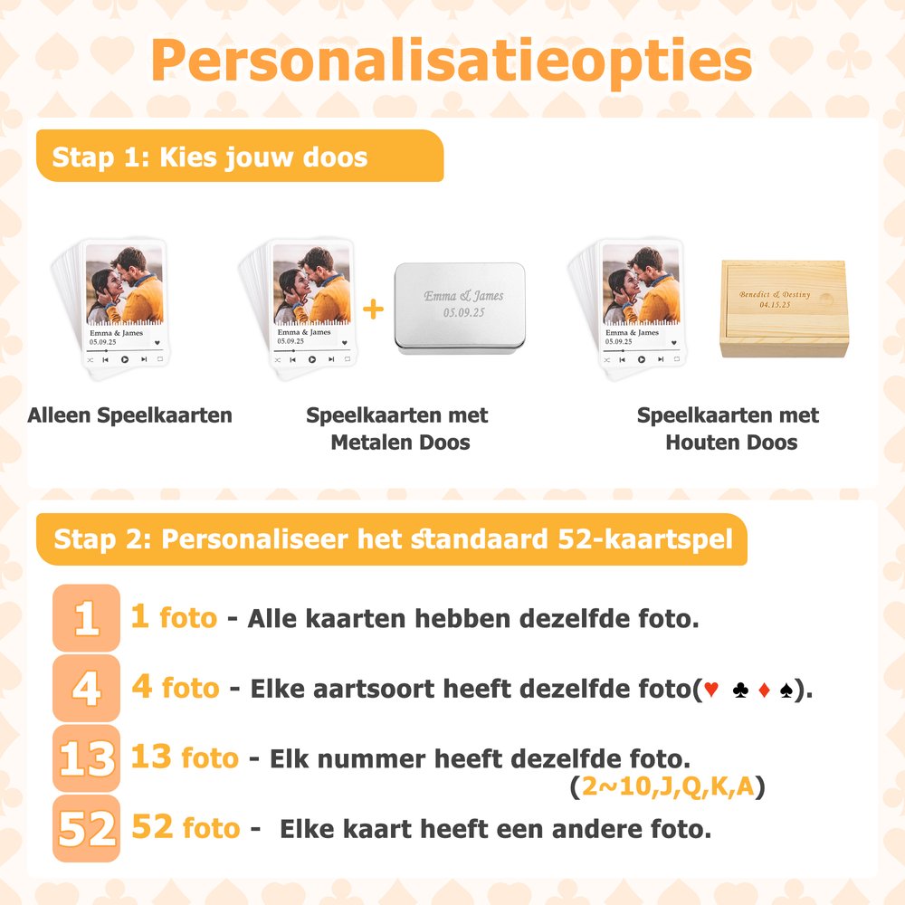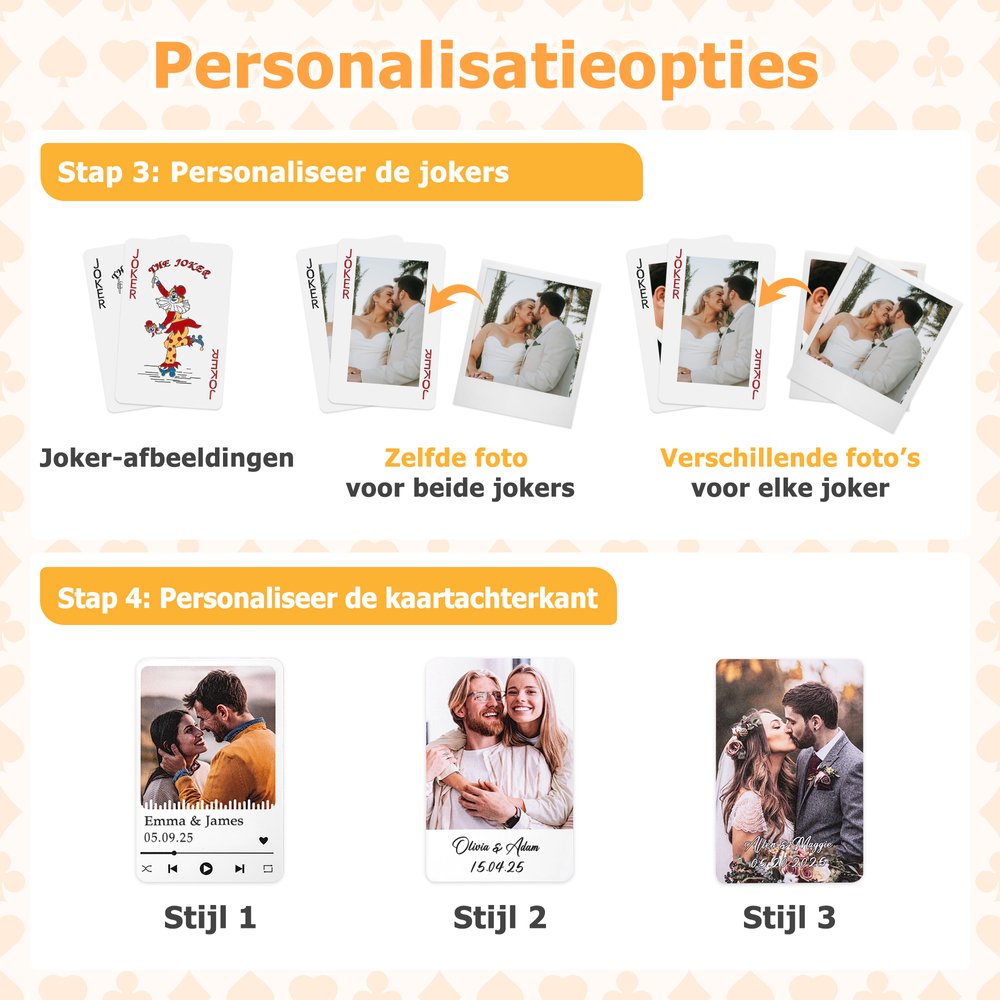 Alle 52 kaarten, behalve de twee jokers, kunnen worden gepersonaliseerd met een foto op de voorkant, zodat je dierbare momenten met geliefden, familietripjes of foto's met vrienden kunt vastleggen. Kies je 1 foto voor de voorkant, dan krijg je 52 kaarten met dezelfde foto. Kies je 4 foto's, dan krijgt elke kleur dezelfde foto. Kies je 13 foto's, dan krijgt elk nummer dezelfde foto. Kies je 52 foto's, dan krijgt elke kaart een unieke foto. De twee jokers kunnen ook in drie verschillende gepersonaliseerde stijlen worden gemaakt. De achterkant van elke kaart heeft een unieke foto en kan worden aangepast met je naam en datum.