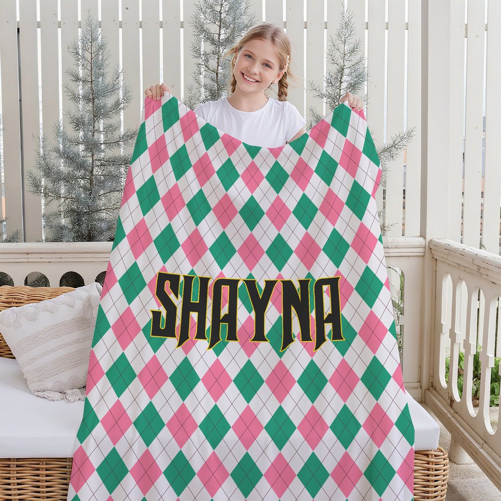Deze deken, versierd met een opvallend roze en groen prismatisch ruitpatroon, heeft een grillige en magische uitstraling. De vetgedrukte naam in een charmant heksenlettertype voegt een uniek en persoonlijk tintje toe voor fans van magische verhalen.