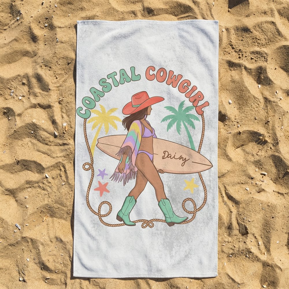 Deze handdoek is een mix van de trendy Coastal Cowgirl-esthetiek en combineert op creatieve wijze western cowboyhoeden en retro laarzen met surfplanken op het strand en palmbomen. Het heeft heldere retrokleuren en straalt een sterke Amerikaanse vintage vakantiesfeer uit. Met de aanpasbare naamopties wordt elk handdoekje een exclusief stuk dat stijlvolle herkenning en een speelse persoonlijkheid biedt, waardoor het een opvallend accessoire wordt op het strand of bij het zwembad.
