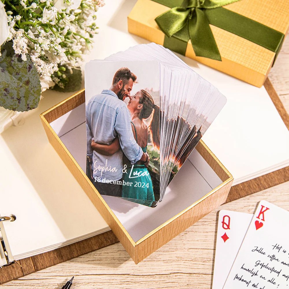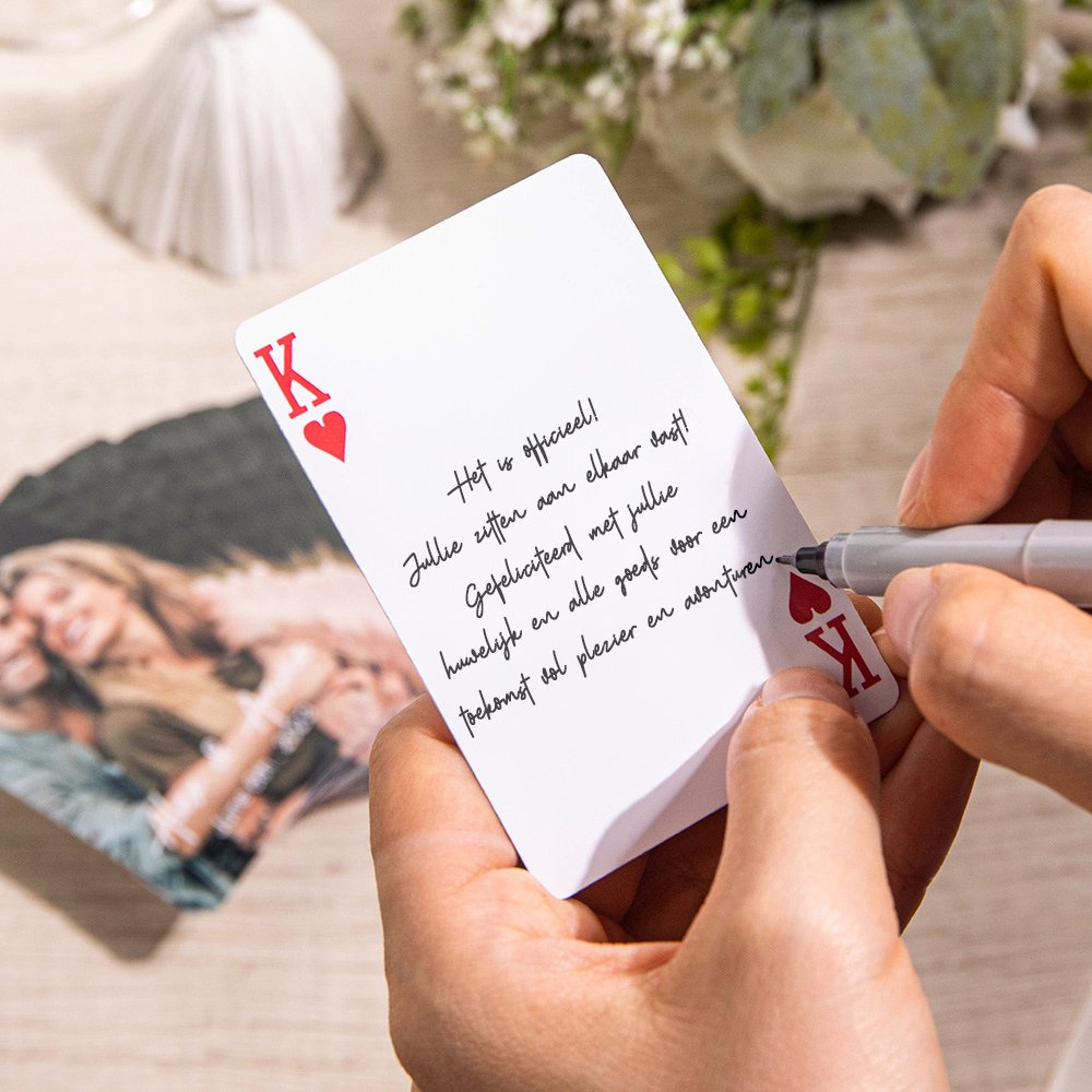 Deze op maat gemaakte speelkaarten zijn een origineel alternatief voor het traditionele bruiloftsgastenboek. U kunt uw foto op de achterkant laten plaatsen. De voorkant is blanco met speelkaartsymbolen in de hoeken, zodat de gasten hun wensen op de kaarten kunnen schrijven. Na het schrijven kunt u de kaarten apart neerleggen. Stapel ze niet direct op om vlekken te voorkomen. Op olie gebaseerde markers drogen meestal binnen enkele seconden.