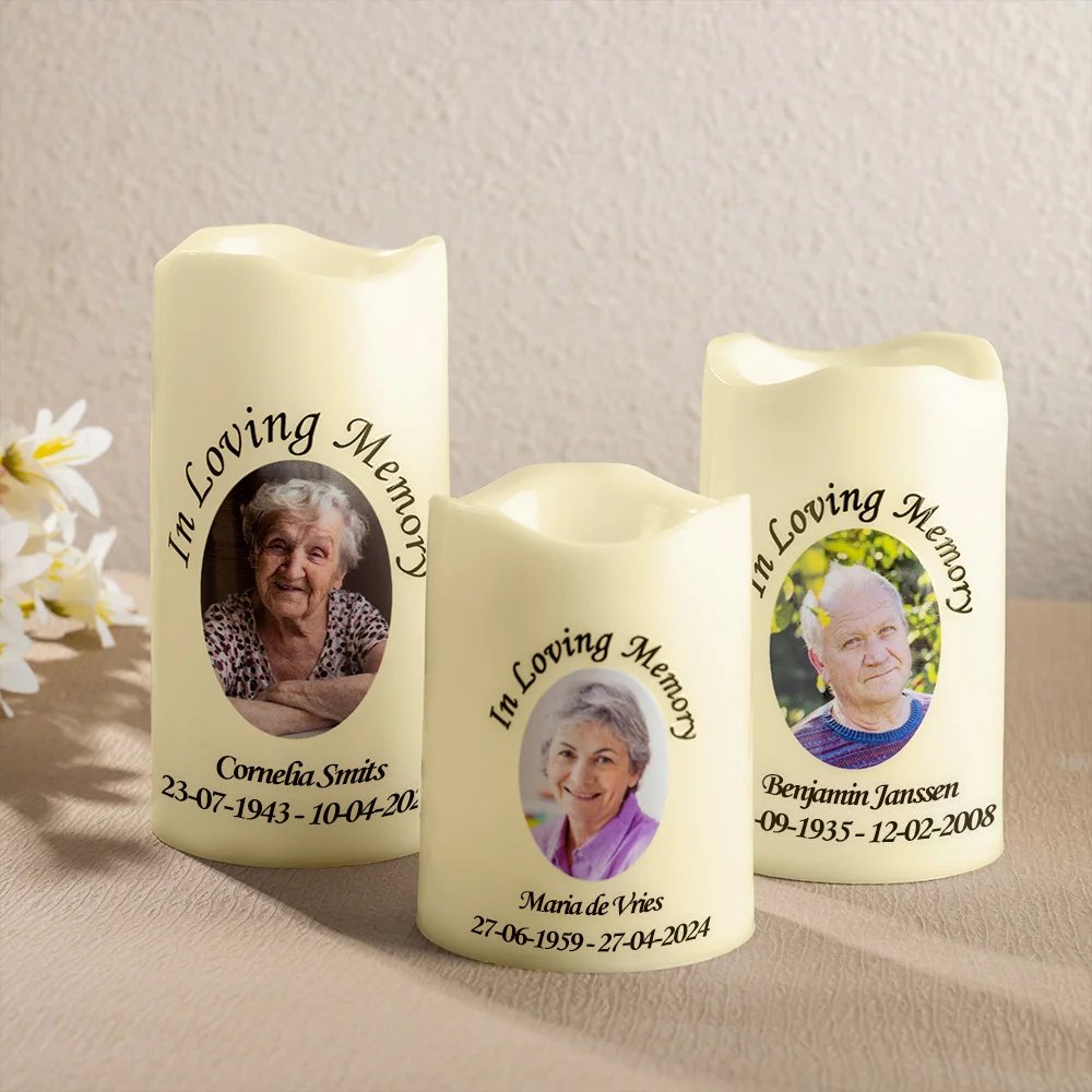 Je kunt een foto, naam en datum van je overleden dierbare op deze kaars laten zetten, waardoor hij een persoonlijke en blijvende betekenis krijgt. Op de achterkant van de kaars staat de tekst: "Those who touch our lives, stay in our hearts forever." Zo wordt de herinnering aan je dierbare op een warme manier geëerd. De kaars ziet eruit als een echte kaars, maar is een vlamloze LED-kaars. Hij is niet alleen veilig en milieuvriendelijk, maar kan ook deze dierbare herinnering voor altijd behouden.