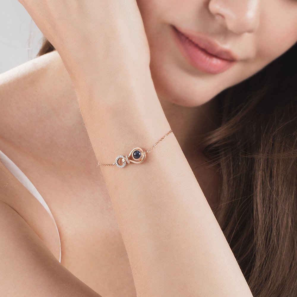 Dit is een uniek microgesneden projectiesieraad, dat verkrijgbaar is in kettingen en armbanden. Je kunt je ketting of armband aanpassen door foto's met een speciale herinnering te uploaden. Daarnaast kun je ook kiezen of er tekst om de foto heen staat, en het effect van tekst eromheen zal indrukwekkender zijn.