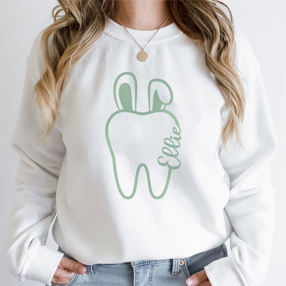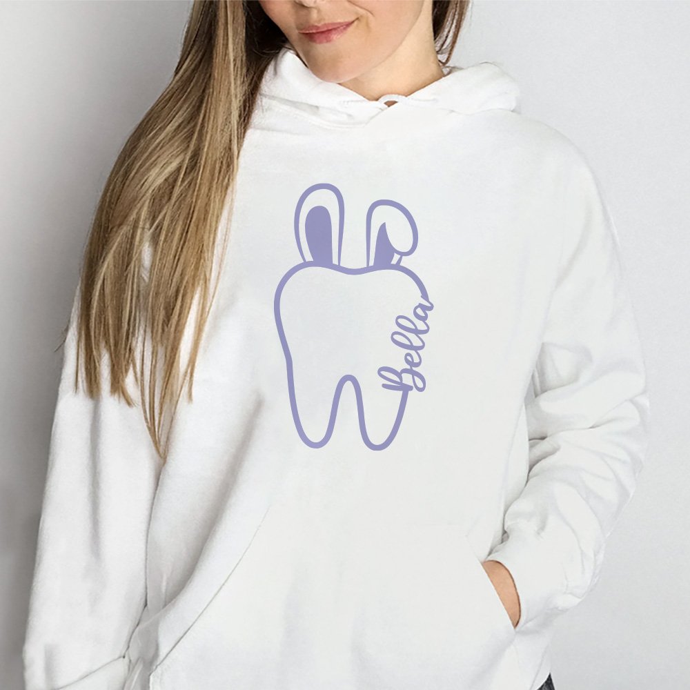 Deze gepersonaliseerde sweater, hoodie of T-shirt met tandenhaasgrafiek is het perfecte paascadeau voor je tandarts. De kleding combineert stijl, maatwerk en comfort, waardoor het dierbare en draagbare herinneringen zijn die dienen als herinnering aan hun impact.