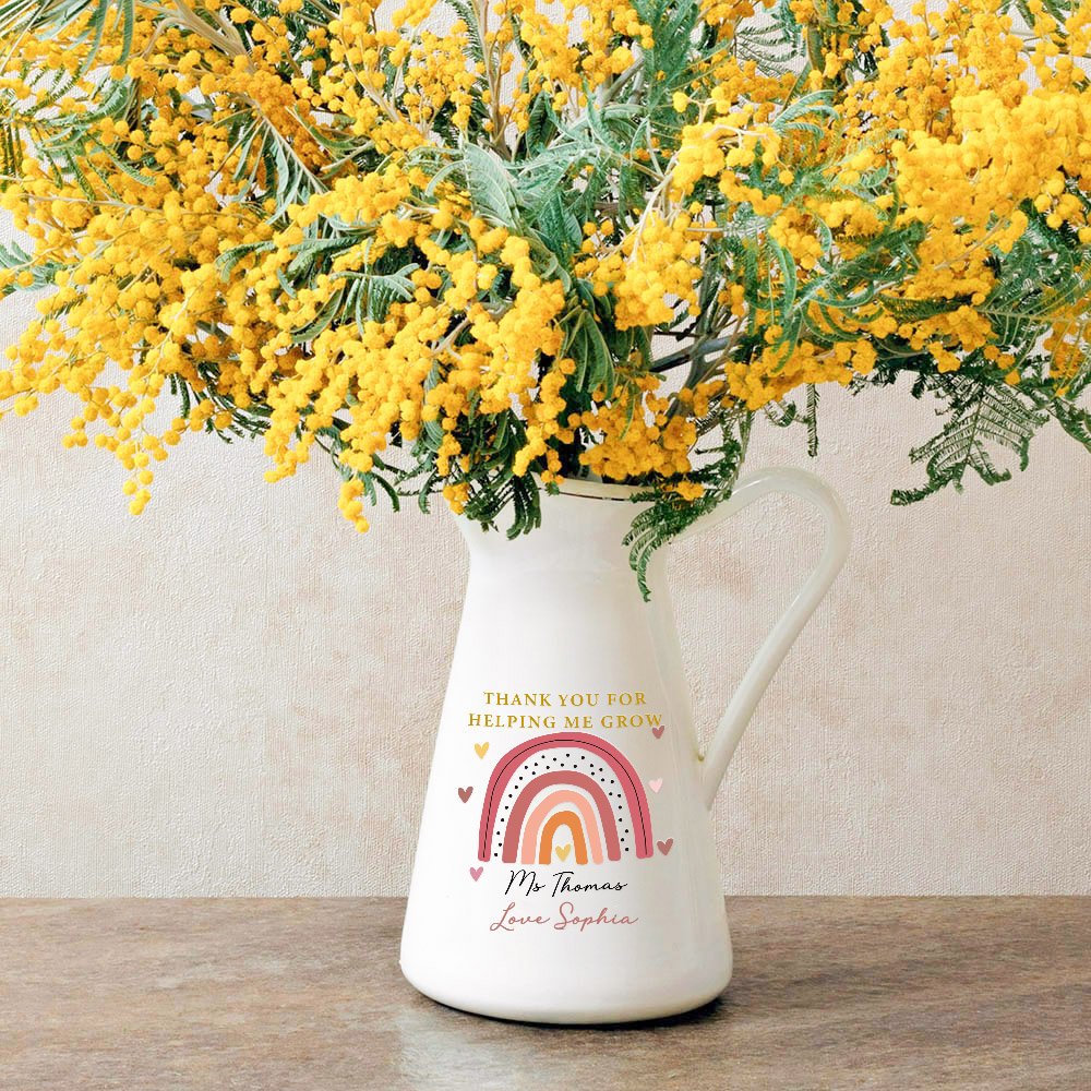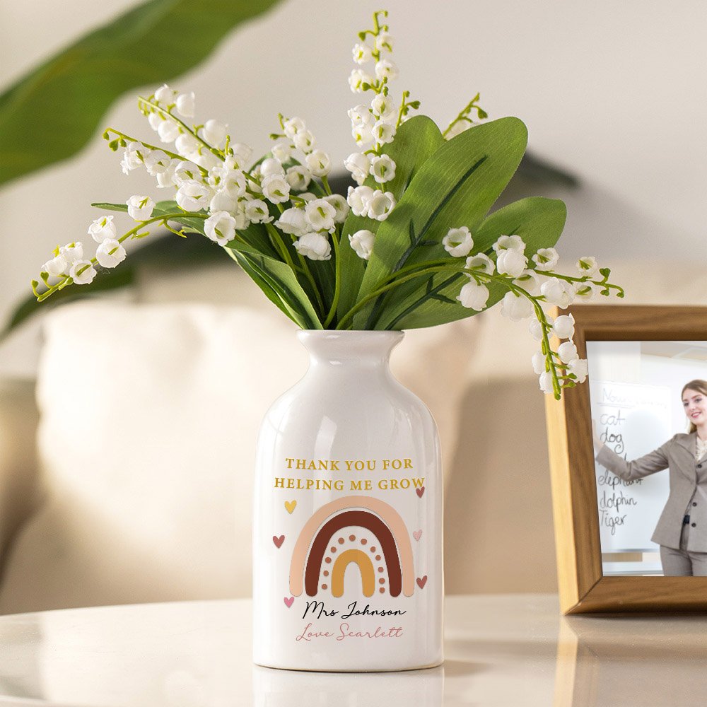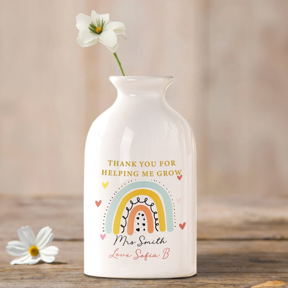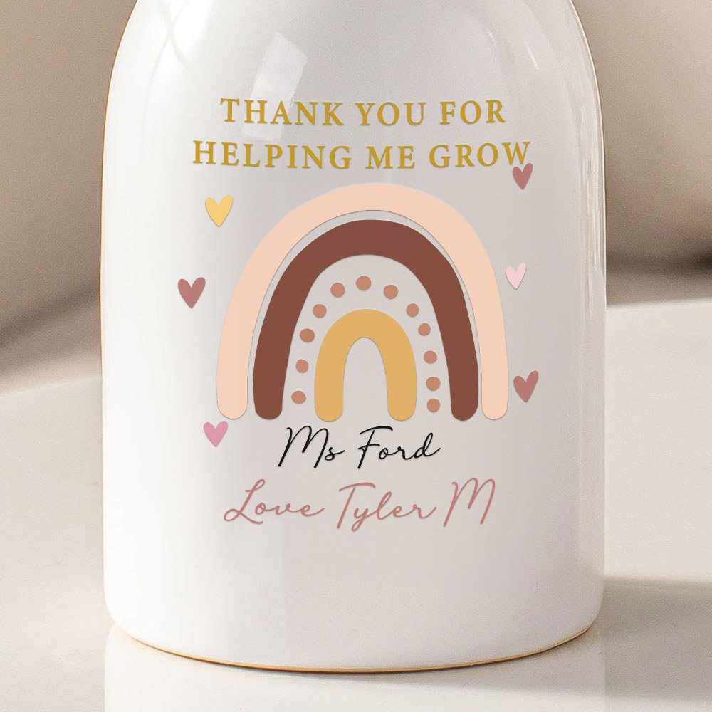 De vaas heeft een levendig en opvallend regenboogmotief, waardoor het een opvallend stuk woondecoratie is. Met de naam van de leraar en de zin "dank je dat je me hebt geholpen te groeien" prachtig weergegeven, dient het als een oprecht cadeau.