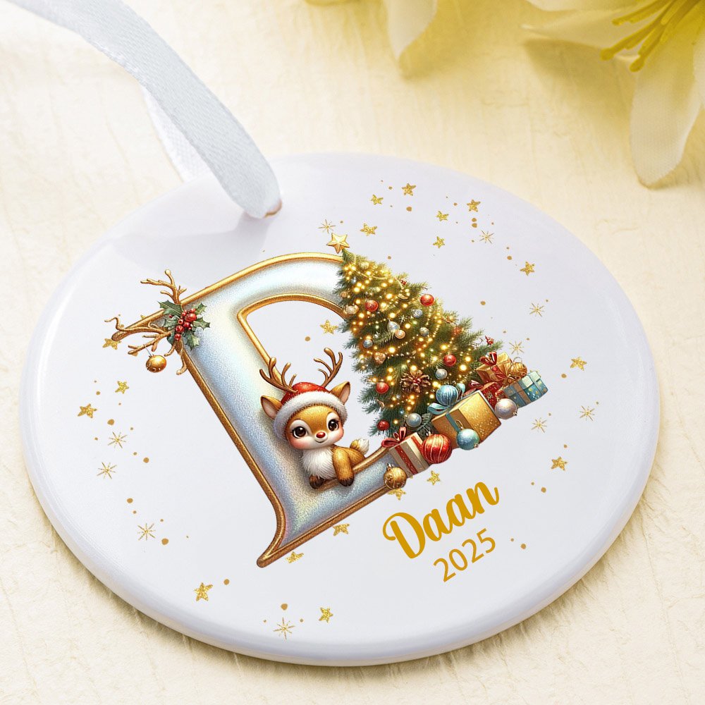 Dit prachtig bewerkte keramieken ornament is versierd met de feestelijke kerstinitialen, schattige rendieren en een kerstboom. U kunt het personaliseren met uw naam en het jaar, waardoor dit ornament een betekenisvolle weergave van het kerstseizoen wordt.
