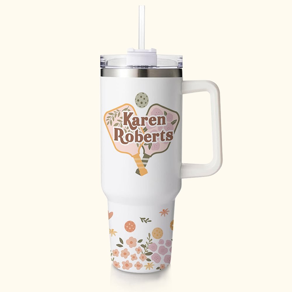 Deze beker heeft een stijlvol en opvallend retro bloemenpatroon op het pickleball-paddle; pas de beker aan met de naam van de ontvanger en verander het in een uniek cadeau dat hun passie voor sport en persoonlijke stijl viert.