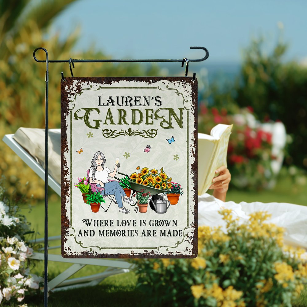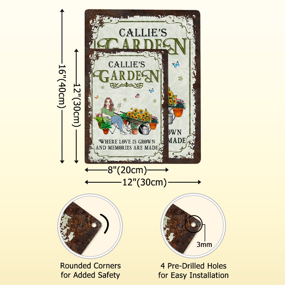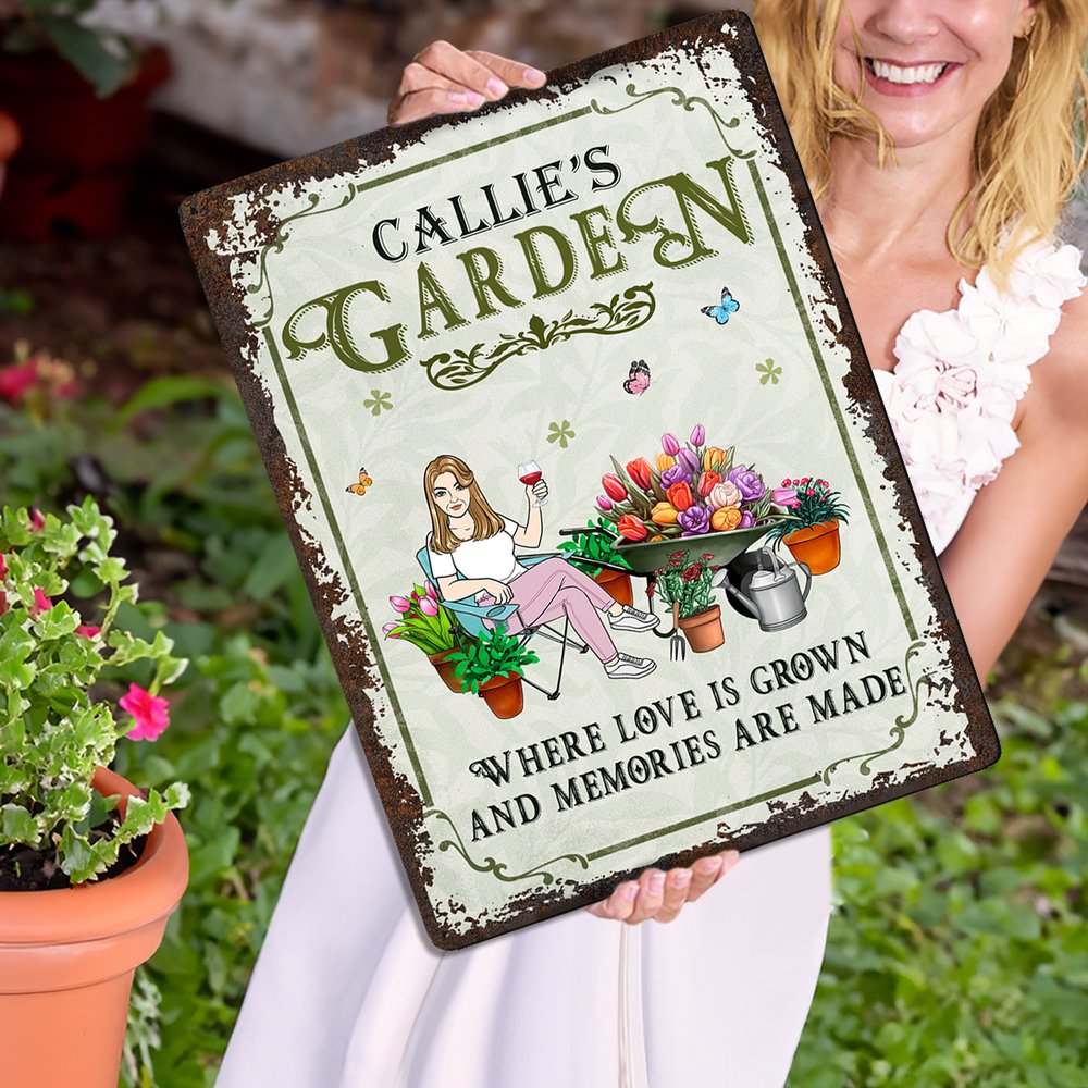 Dit metalen bord bevat een praalwagen, waterkoker, vlinders, bloempotten en een vintage stripfiguur die aan een drankje nipt. De woorden "Where love is grown and memories are made" zijn gedrukt op de onderkant en creëren een levendige en vrolijke tuin. Bovendien kan elk bord worden aangepast met een naam en karakter, waardoor de algehele stijl zowel nostalgisch als leuk is.