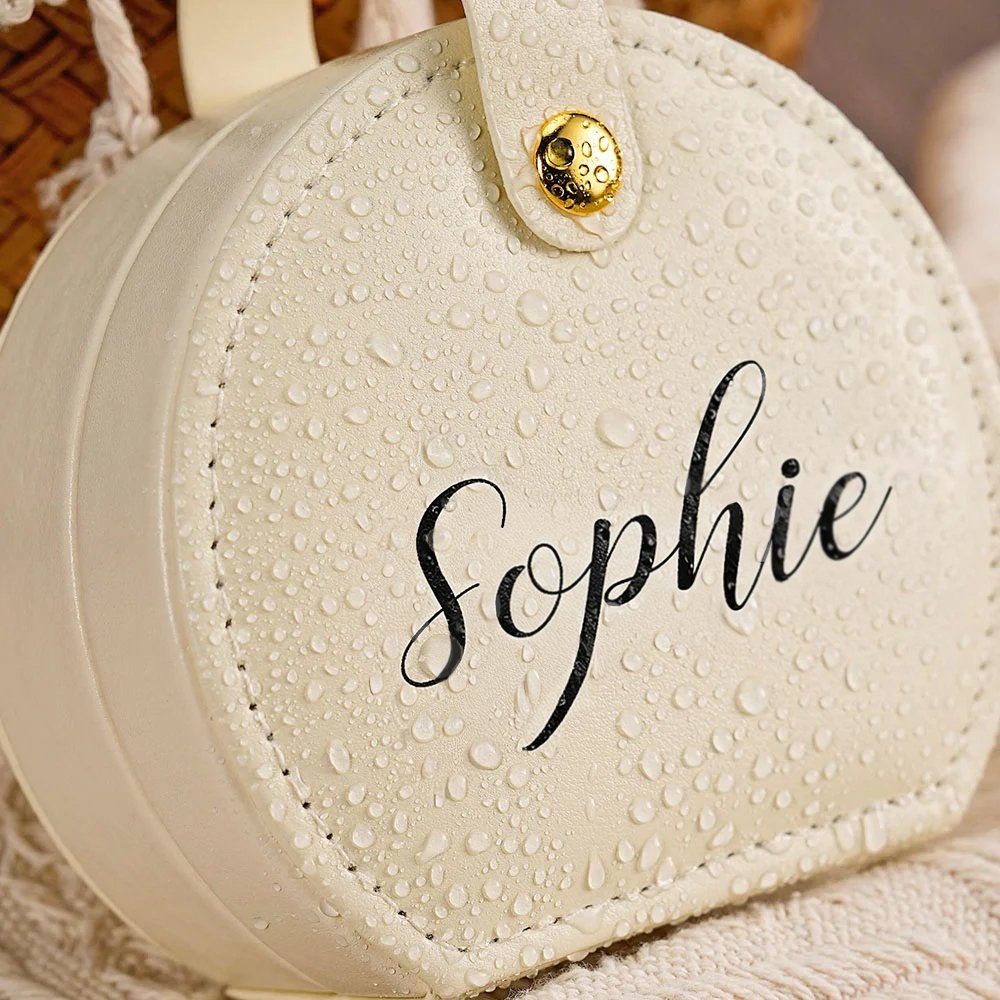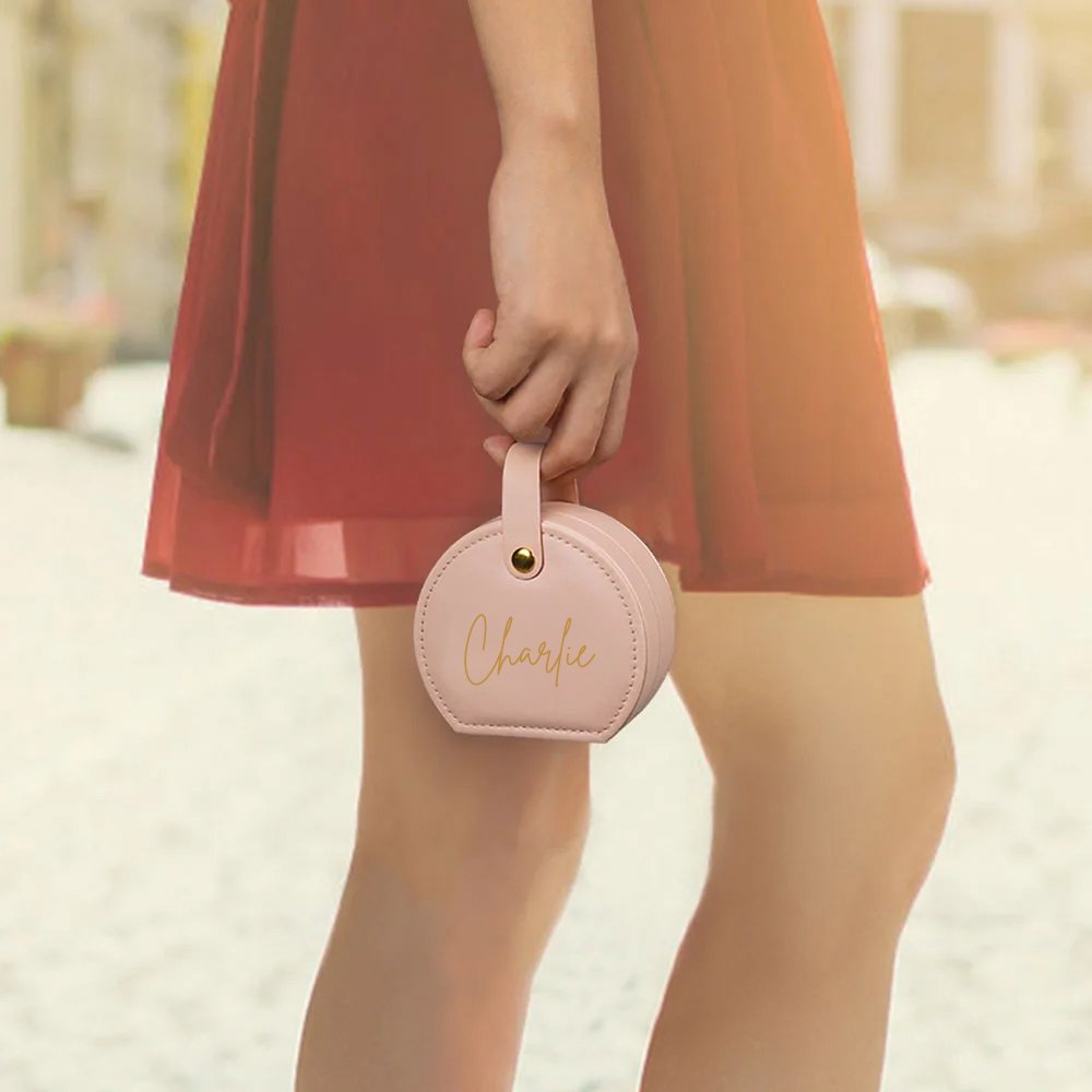 Dit juwelendoosje heeft een opvallende vorm en combineert een stijlvol design met een compact en ruimtebesparend ontwerp voor in je reistas. Je kunt het personaliseren met je naam, waardoor het nog unieker wordt. We bieden 3 lettertypes en 5 kleuren voor de letters, waaruit je naar eigen voorkeur kunt kiezen.