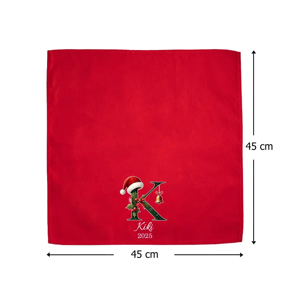 Dit servet heeft een levendige rode achtergrond die een rijke kerstsfeer creëert. De opvallende letters, versierd met een kerstmuts, worden aangevuld met kerstmotieven zoals hulst en belletjes, waardoor een delicate en feestelijke uitstraling ontstaat. De aanpasbare naam voegt een persoonlijk tintje toe, waardoor het meer wordt dan alleen een praktisch item; het wordt een dierbaar geschenk.