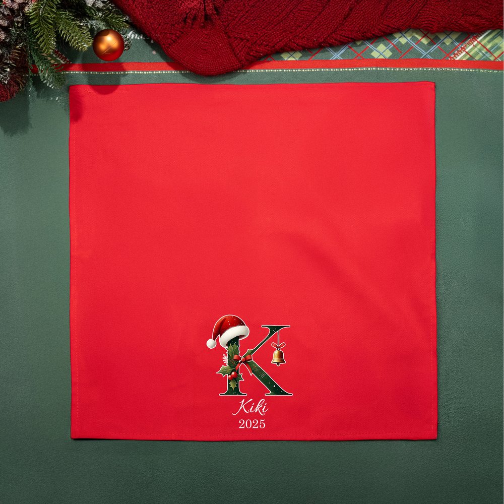 Dit servet heeft een levendige rode achtergrond die een rijke kerstsfeer creëert. De opvallende letters, versierd met een kerstmuts, worden aangevuld met kerstmotieven zoals hulst en belletjes, waardoor een delicate en feestelijke look ontstaat. De aanpasbare naam voegt een persoonlijk tintje toe, waardoor het meer wordt dan alleen een praktisch item; het wordt een dierbaar geschenk.
