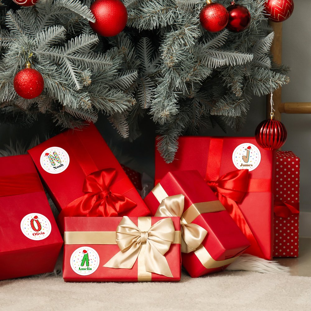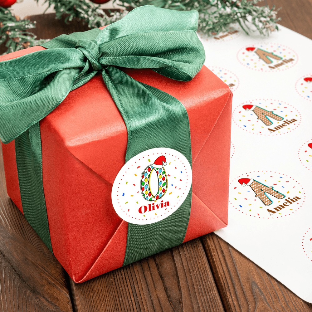 Het combineert speelse illustraties met klassieke kerstelementen. De initialen met kerstmutsen en kleurrijke details hebben een charmante, speelse uitstraling, terwijl de aangepaste namen een persoonlijke en hartelijke touch toevoegen. Het is perfect om een feestelijke, persoonlijke flair toe te voegen aan geschenken.