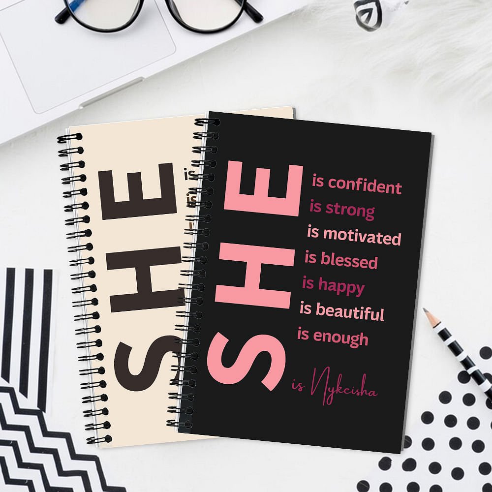 She is Me', een veelzijdig zelfliefde-dagboek ontworpen voor vrouwen. Het is niet zomaar een notitieboekje; het is een hulpmiddel om dagelijkse doelen te stellen, vooruitgang bij te houden, stress te beheersen en emotioneel welzijn te bevorderen. Het is een uitgebreid hulpmiddel voor persoonlijke groei en zelfexpressie.