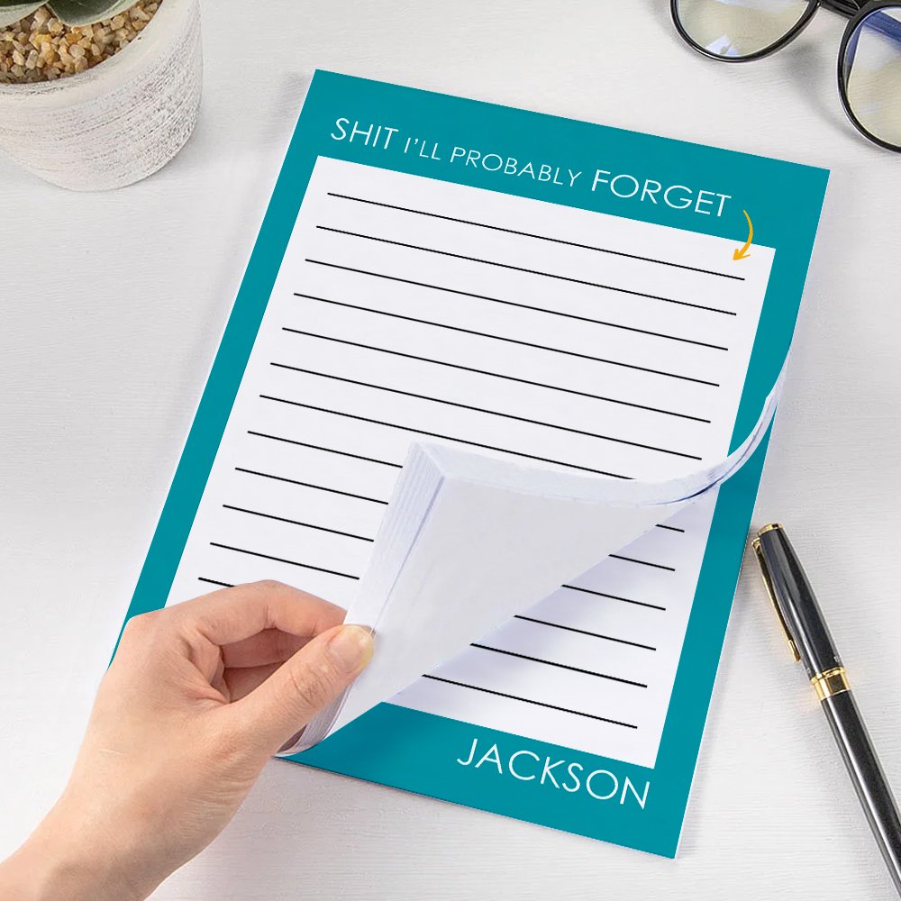 Dit notitieblok is ideaal om notities, to-do lijstjes of herinneringen op te schrijven. Het is beschikbaar in gelinieerde of ongelinieerde opties en heeft een leuke kop met de tekst "Shit I'll Probably Forget", zodat je een duidelijke, georganiseerde ruimte hebt om te schrijven. Dit ontwerp voegt een vleugje humor toe aan je dagelijkse taken, terwijl de mogelijkheid om het aan te passen met je naam het een uniek stuk maakt.